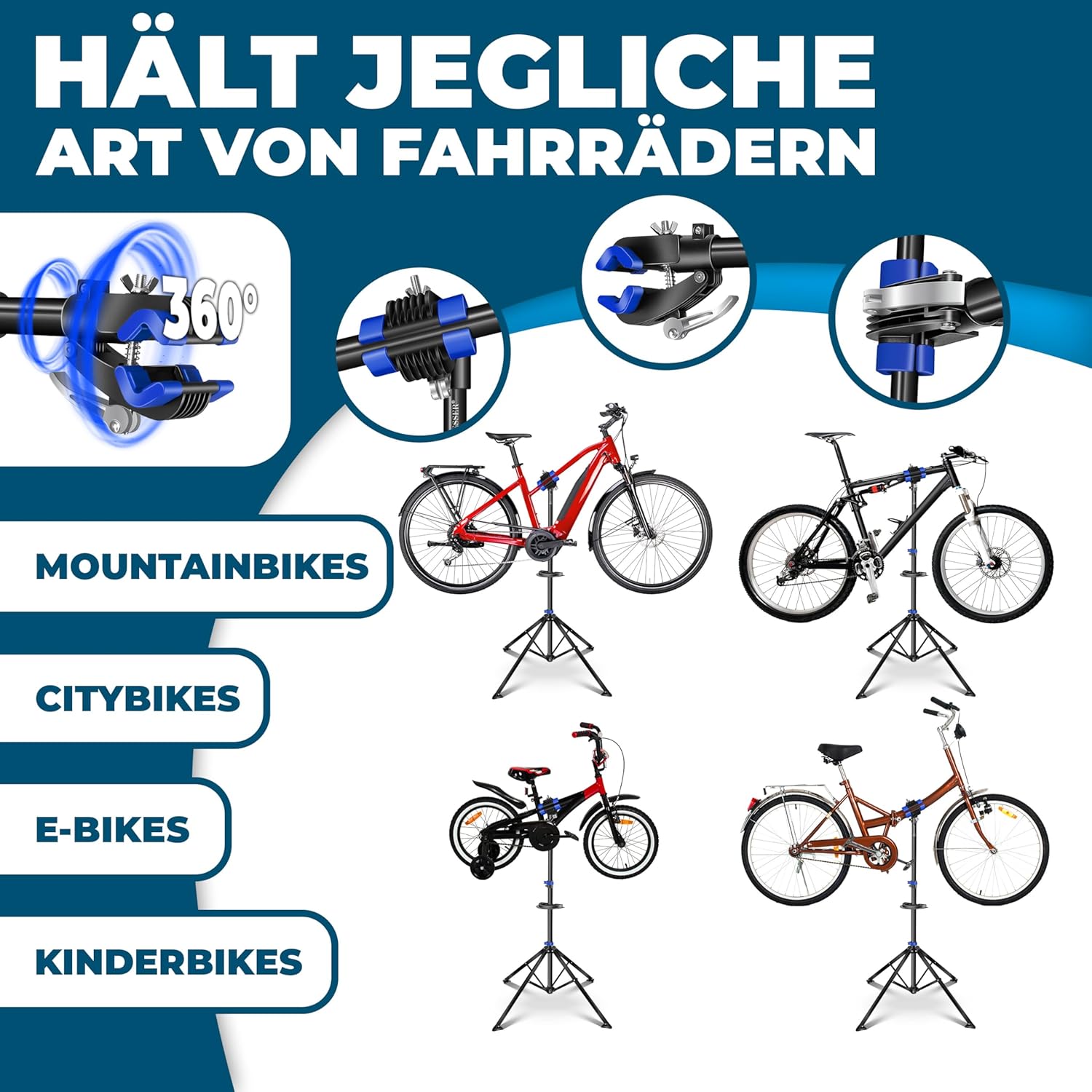 - Multifunctioneel: profiteer van een ultralicht en stabiel montagestatief, dat door zijn flexibele instelmogelijkheden traploos in de hoogte van 115-190 cm kan worden ingesteld en bovendien 360 graden traploos draaibaar is. Je fiets kan perfect in de voorwielfixeerstang worden gestoken en deze past op alle gebruikelijke framematen en modellen.