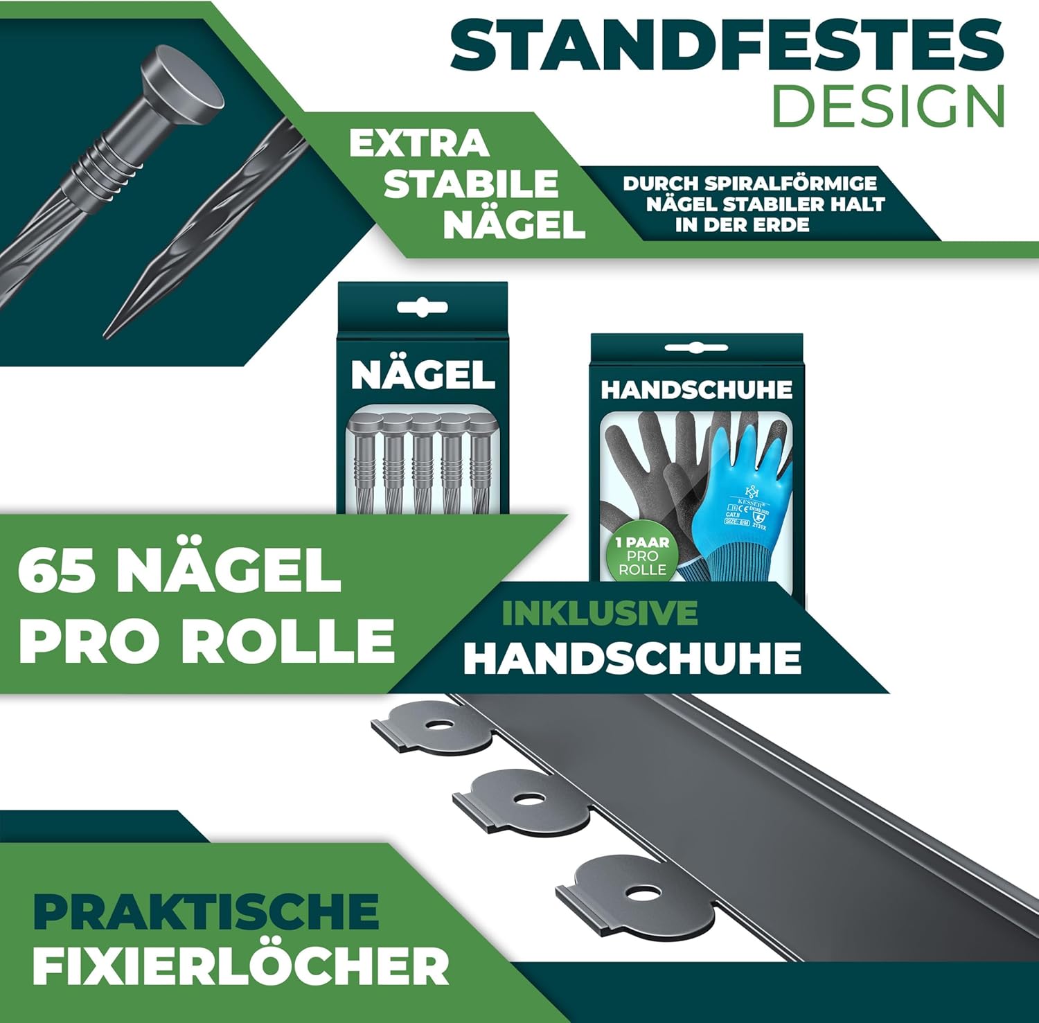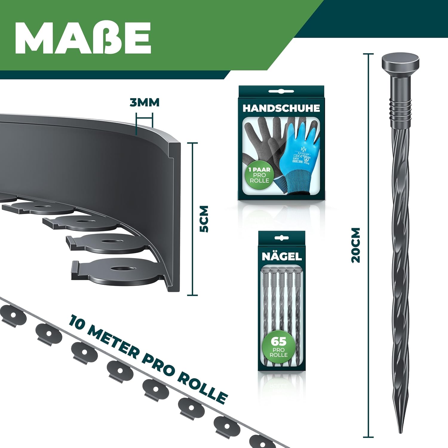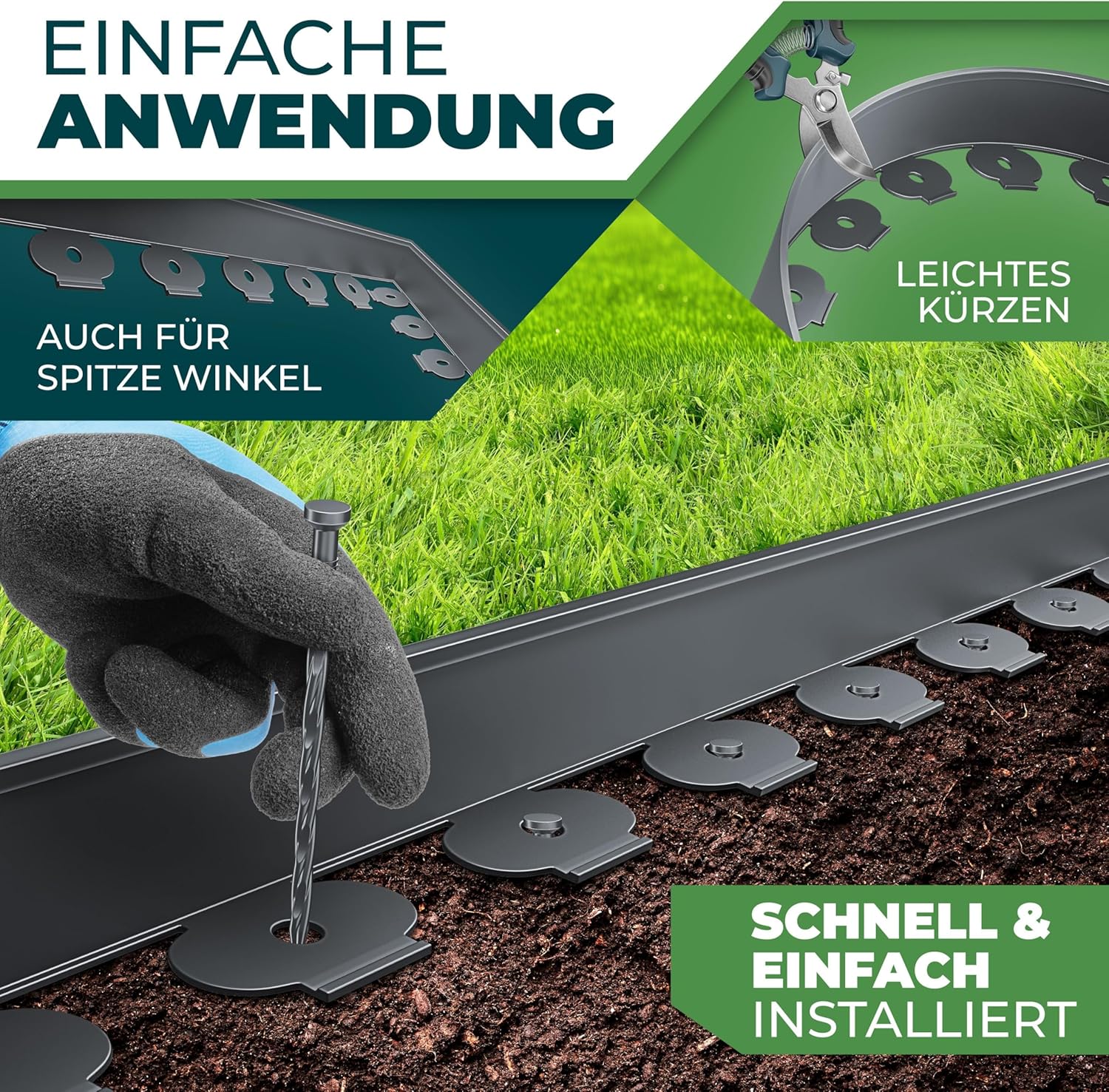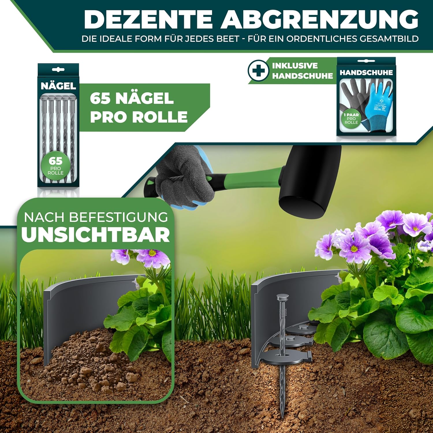 De kunststof gazonrand is uitstekend geschikt voor het maken van bloemperken, perkranden en perkbegrenzingen. Door het flexibele gebruik kunnen bochten, hoeken en hoeken van 90° met de afscheiding worden gemaakt, omdat onze gazonranden kunnen worden gebogen. Of het nu gaat om gazon, bloembed, beton of steen en kiezeloppervlakken, de rand kan universeel worden gebruikt. Dankzij de spiraalvormige punten van de nagels kan de rand ideaal in de grond worden bevestigd.