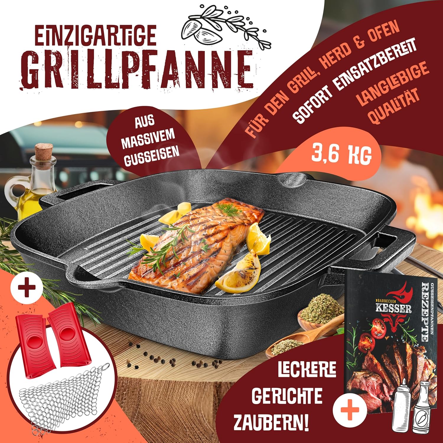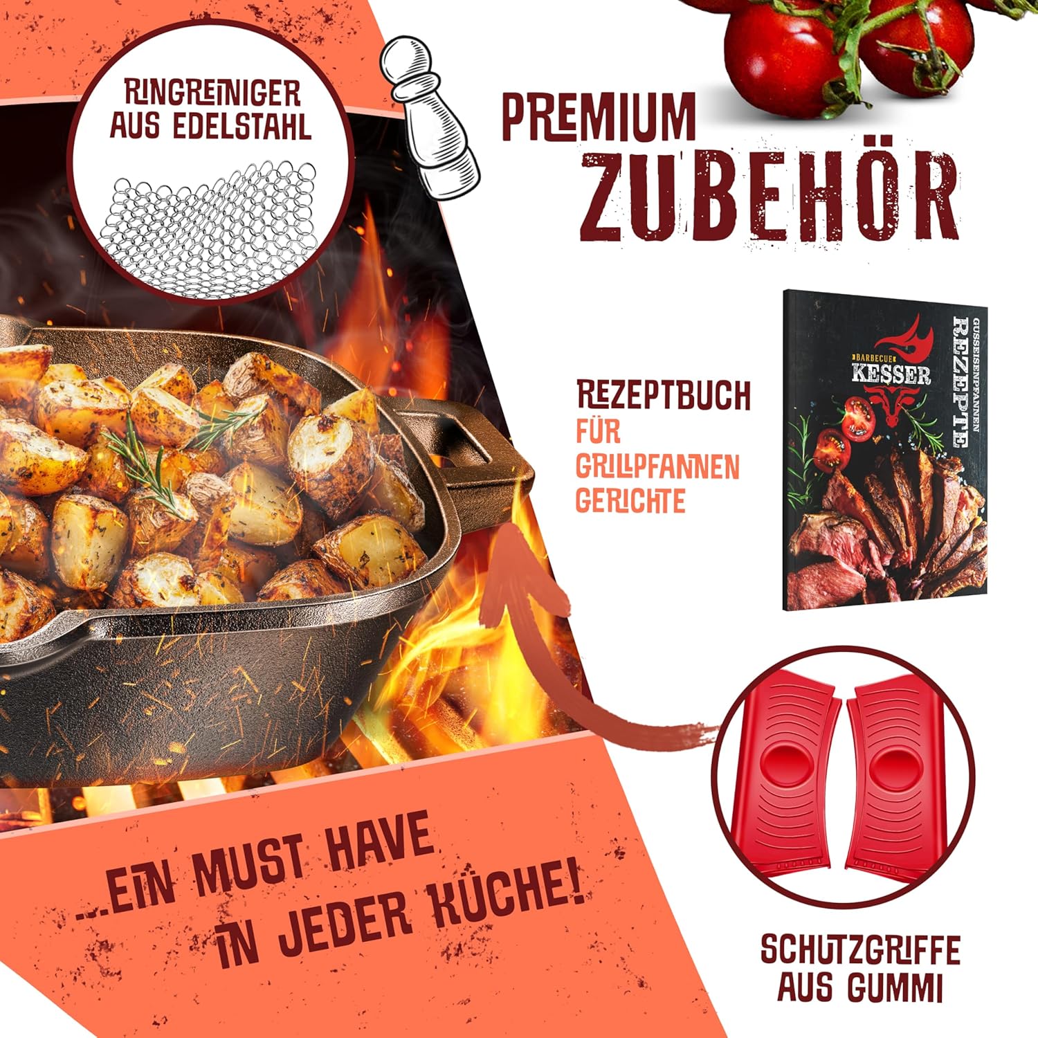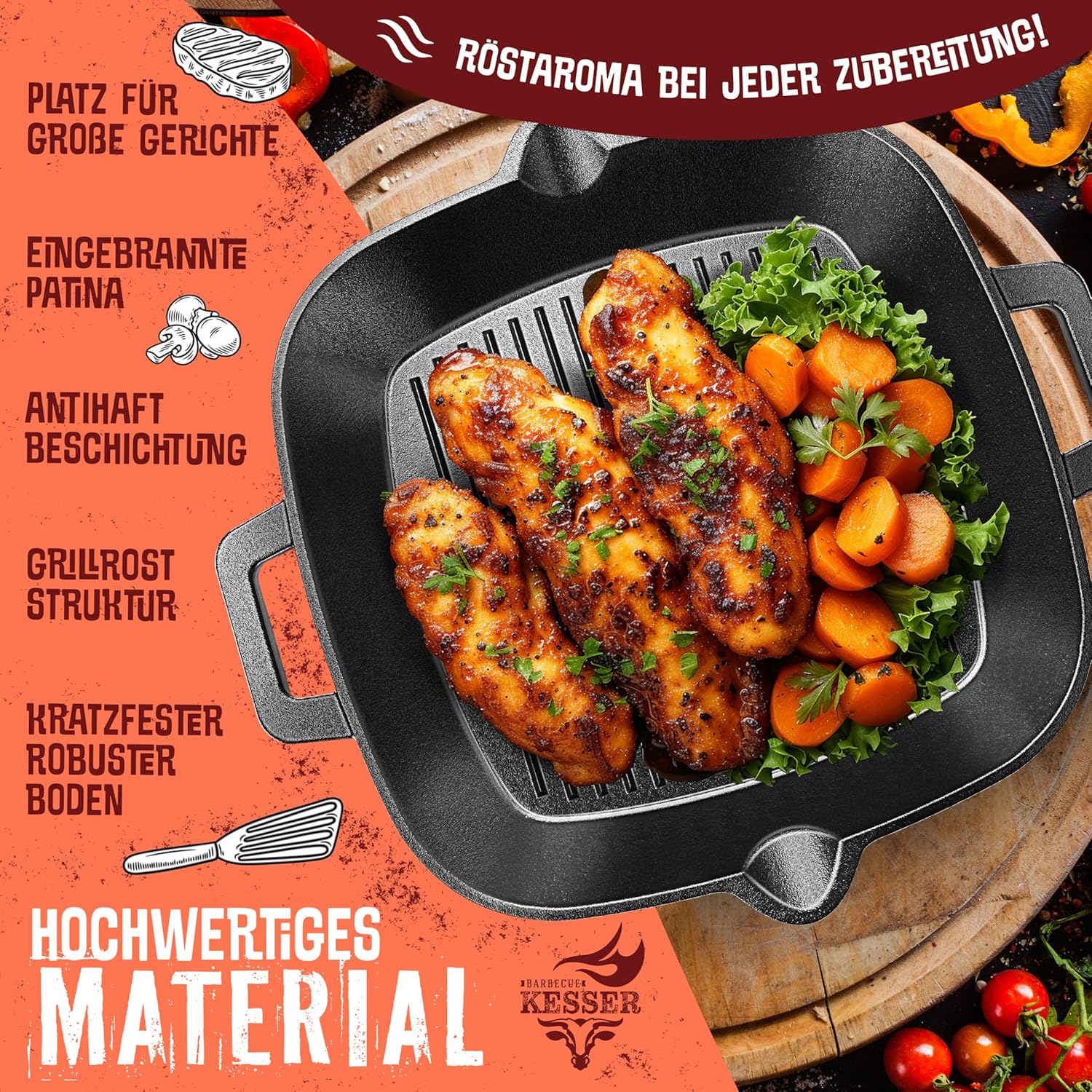 Duurzaam gietijzer voor elke kookmachine: de massieve constructie van hoogwaardig gietijzer garandeert een lange levensduur en duurzame kwaliteit. Gietijzer staat bekend om zijn uitstekende warmteverdeling, wat het koken en braden met een nauwkeurige temperatuur mogelijk maakt en elk gerecht verfijnt met intens geroosterd aroma. Deze pan is bestand tegen elke belasting en blijft vele jaren behouden.