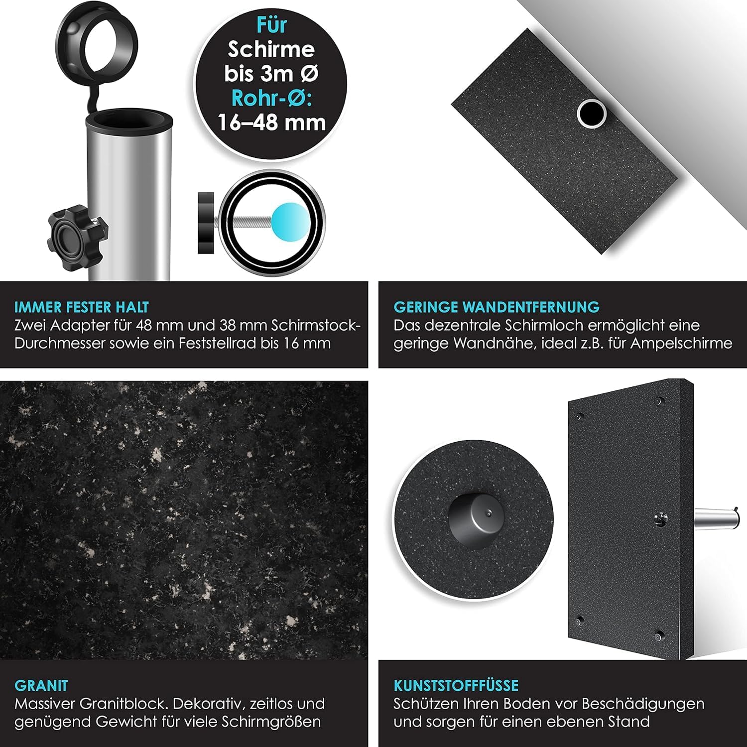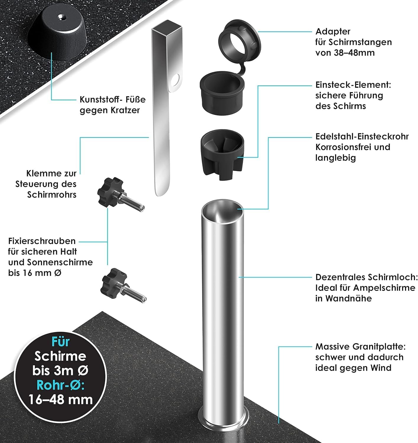 Twee adapters voor parasolstokdiameters van 4,8 cm en 3,8 cm , evenals een vergrendelingswieltje, worden meegeleverd. Dit zorgt voor een stabiele stand van elke parasol . Het parasolgat maakt een nauwe plaatsing mogelijk , waardoor de parasol ideaal is voor bijvoorbeeld zweefparasols .