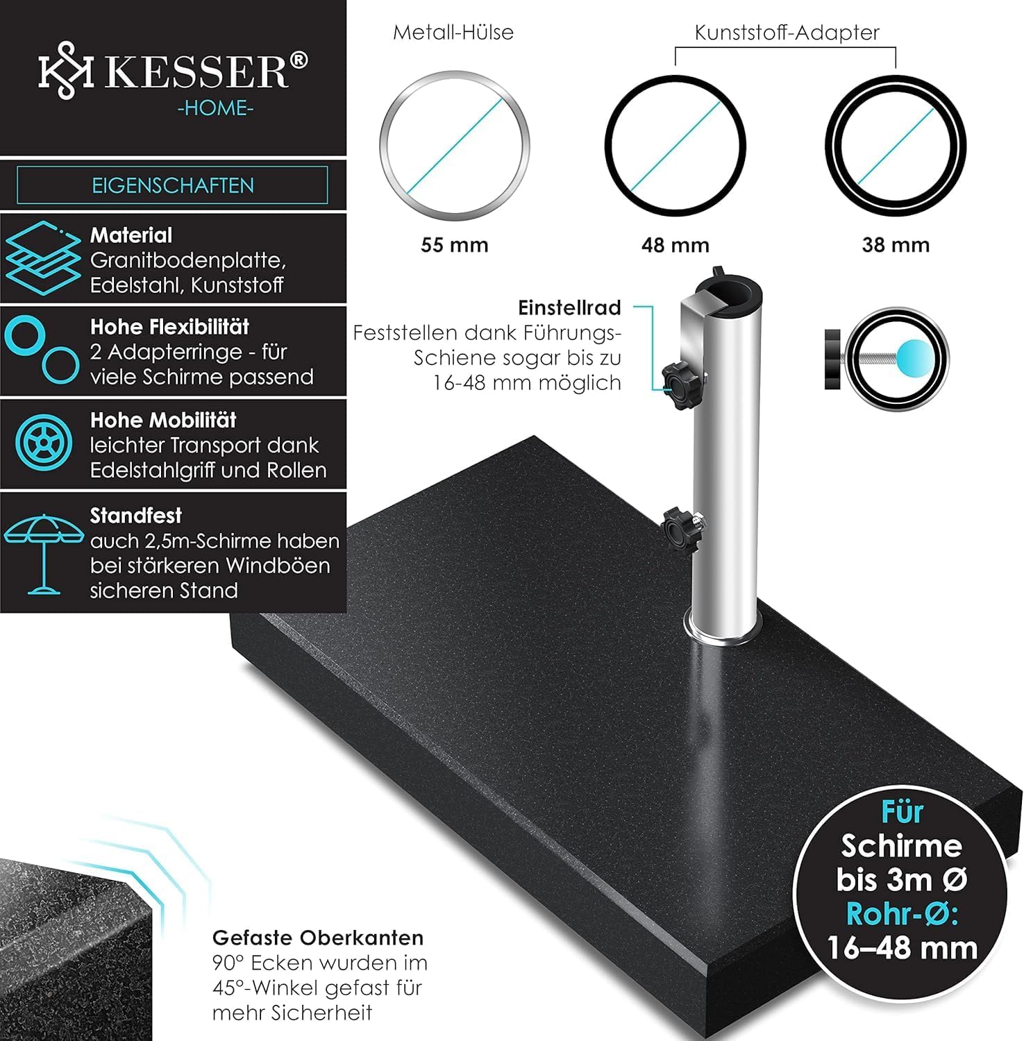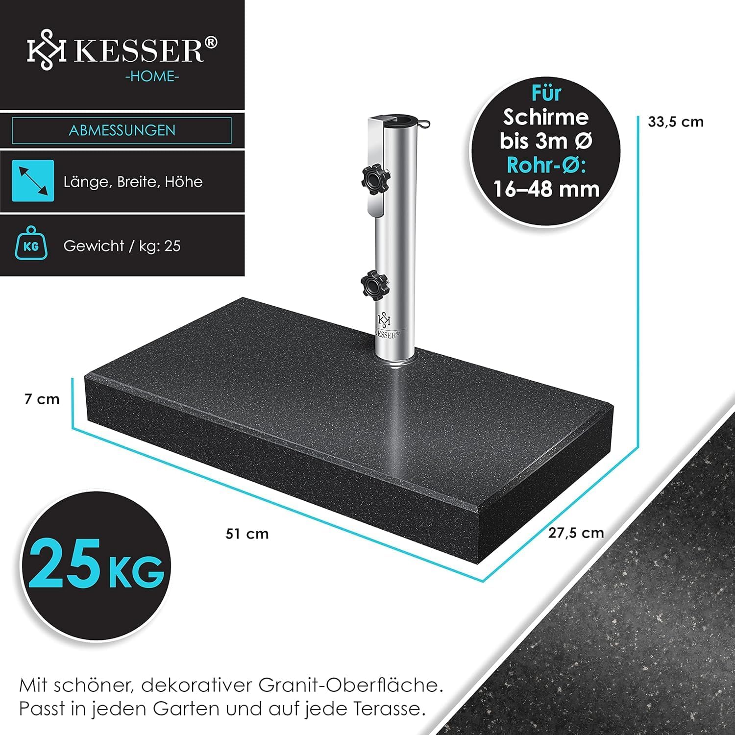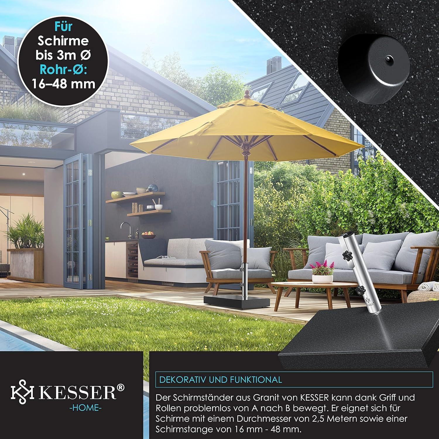 De massief granieten parasolvoet van KESSER garandeert een stevige basis dankzij het zware gewicht en voorkomt dat hij omvalt bij windvlagen . Dankzij onze twee verschillende kleuren vindt u zeker de perfecte zweefparasolvoet voor uw tuin . Hij past perfect in uw tuin en is een echte blikvanger op uw volgende tuinfeest met vrienden of familie .