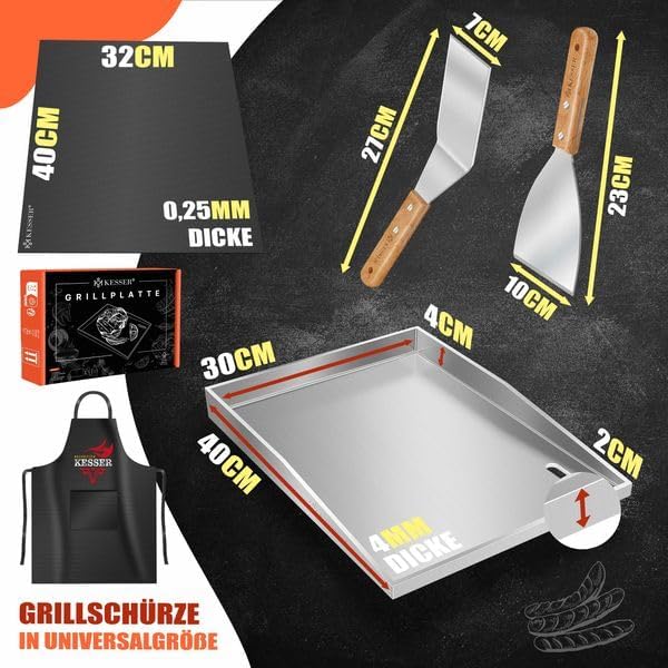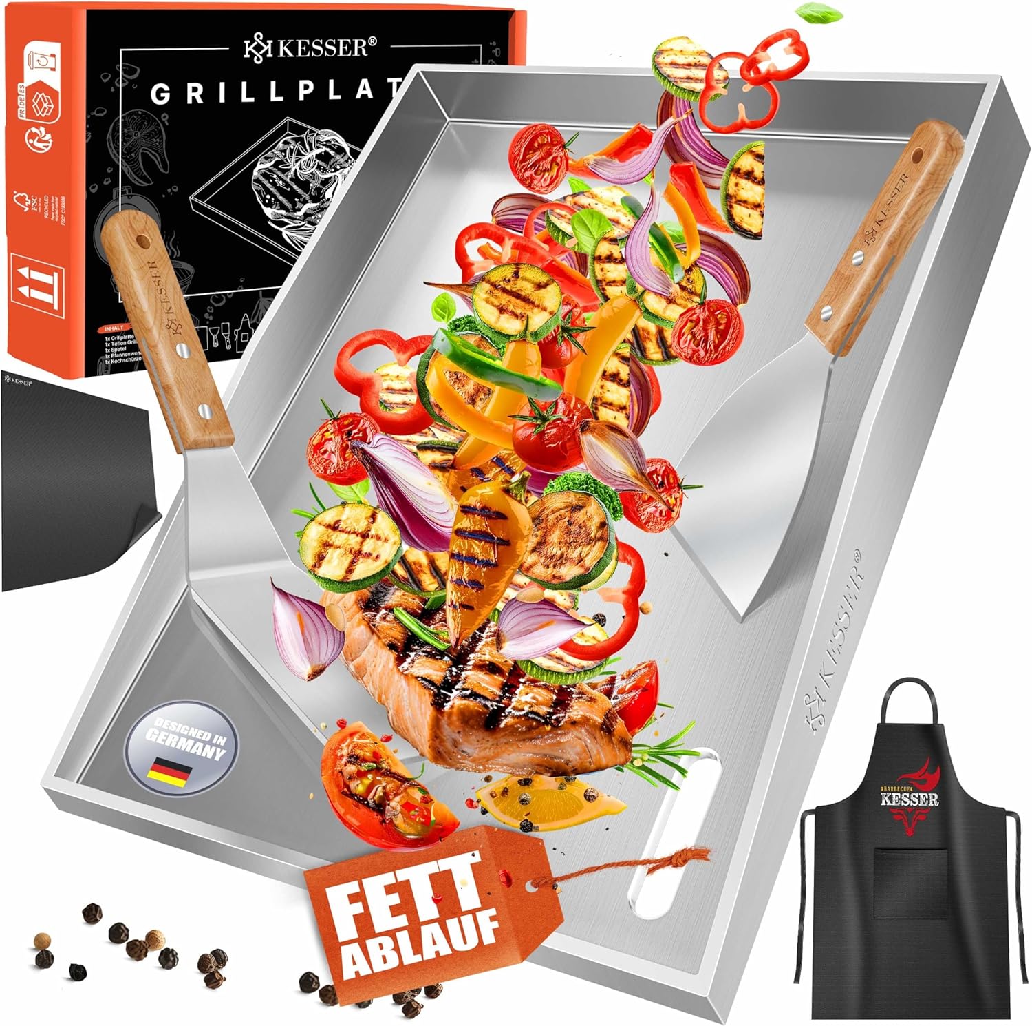 Veelzijdig inzetbaar: met een afmeting van 40 x 30 x 4 cm past de KESSER Plancha op vrijwel elke grill en is universeel inzetbaar. Of het nu voor sappige steaks, knapperige smashburgers, delicate groenten of delicate zeevruchten is, de grillplaat verandert je grill in een veelzijdig kookoppervlak en opent geheel nieuwe culinaire mogelijkheden voor onvergetelijke barbecue-avonden met familie en vrienden.