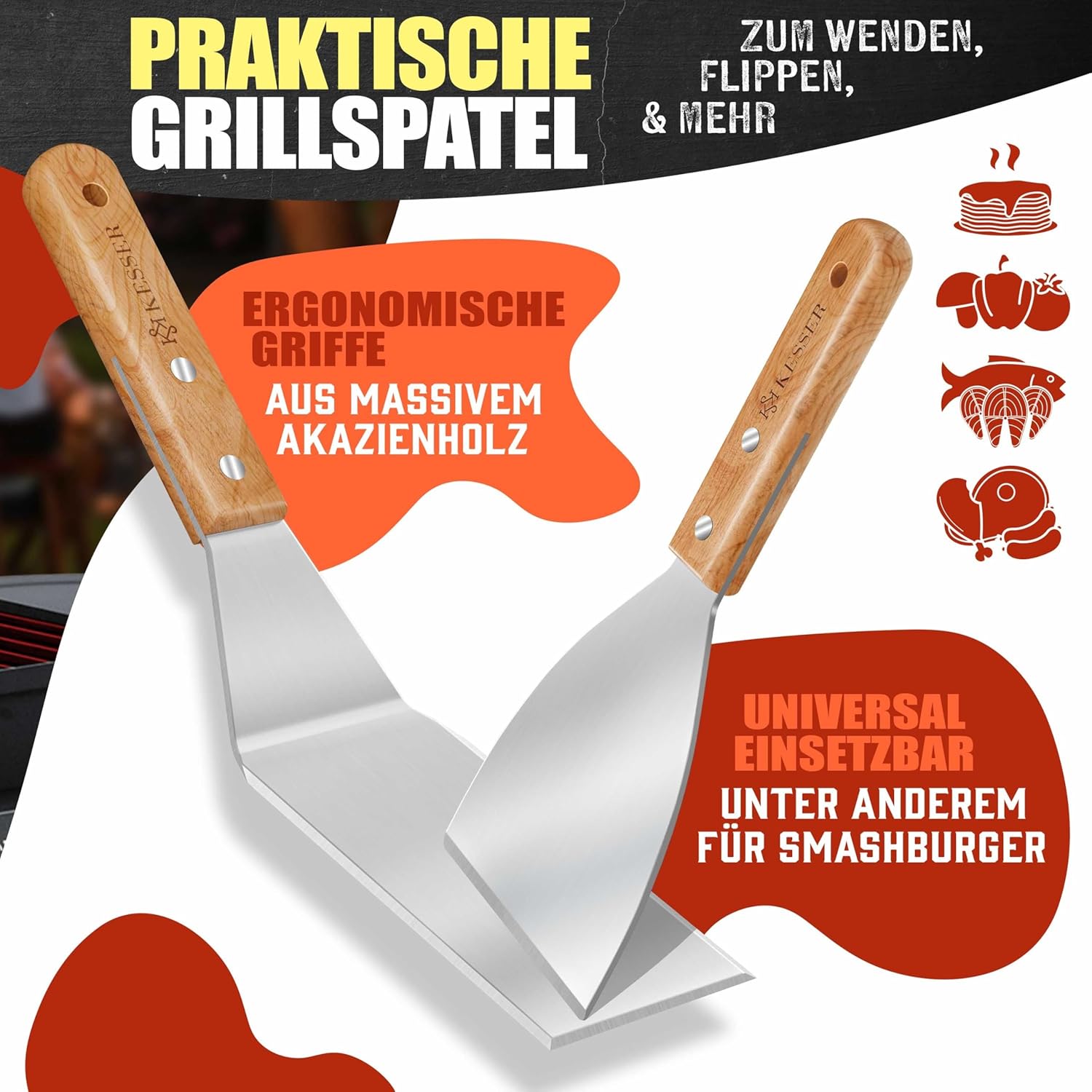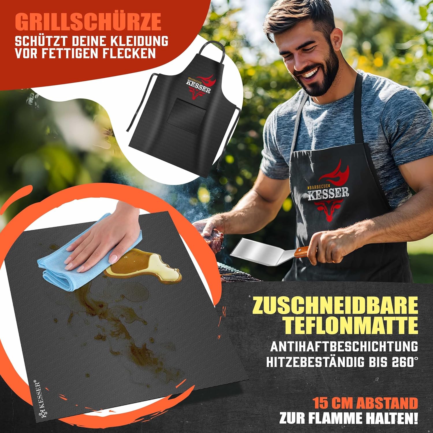 Uitgebreide accessoires: de set bevat twee hoogwaardige grillspatels met ergonomische handgrepen van massief acaciahout - perfect voor het draaien, lappen en bereiden van smashburgers. Daarnaast ontvang je een barbecueschort in universele maat, dat je kleding beschermt tegen vetspatten en een teflon mat op maat te snijden met anti-aanbaklaag, hittebestendig tot 260 °C (houd 15 cm afstand van de vlam)