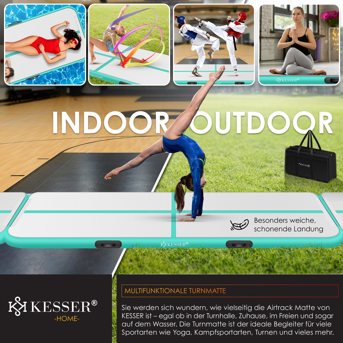 BINNEN EN BUITEN: Op het strand, in de tuin op het gras of in het water - de trainingsmat kan bijna overal worden gebruikt. In de trainingsfaciliteit, in fitnessclubs, in dansclubs, op scholen, in sportscholen, in het park, in recreatiecentra, op de camping, op kantoor of thuis. Met de elektrisch opblaasbare vloermat van KESSER zijn er veel mogelijke toepassingen voor "groot en klein".