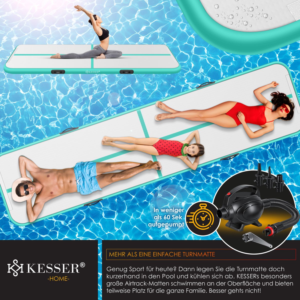 Binnen en buiten: om te zwemmen in het meer, als gymnastiekmat of voor tumbling - met de elektrisch opblaasbare vloermat van KESSER zijn er veel toepassingsmogelijkheden voor "jong en oud".