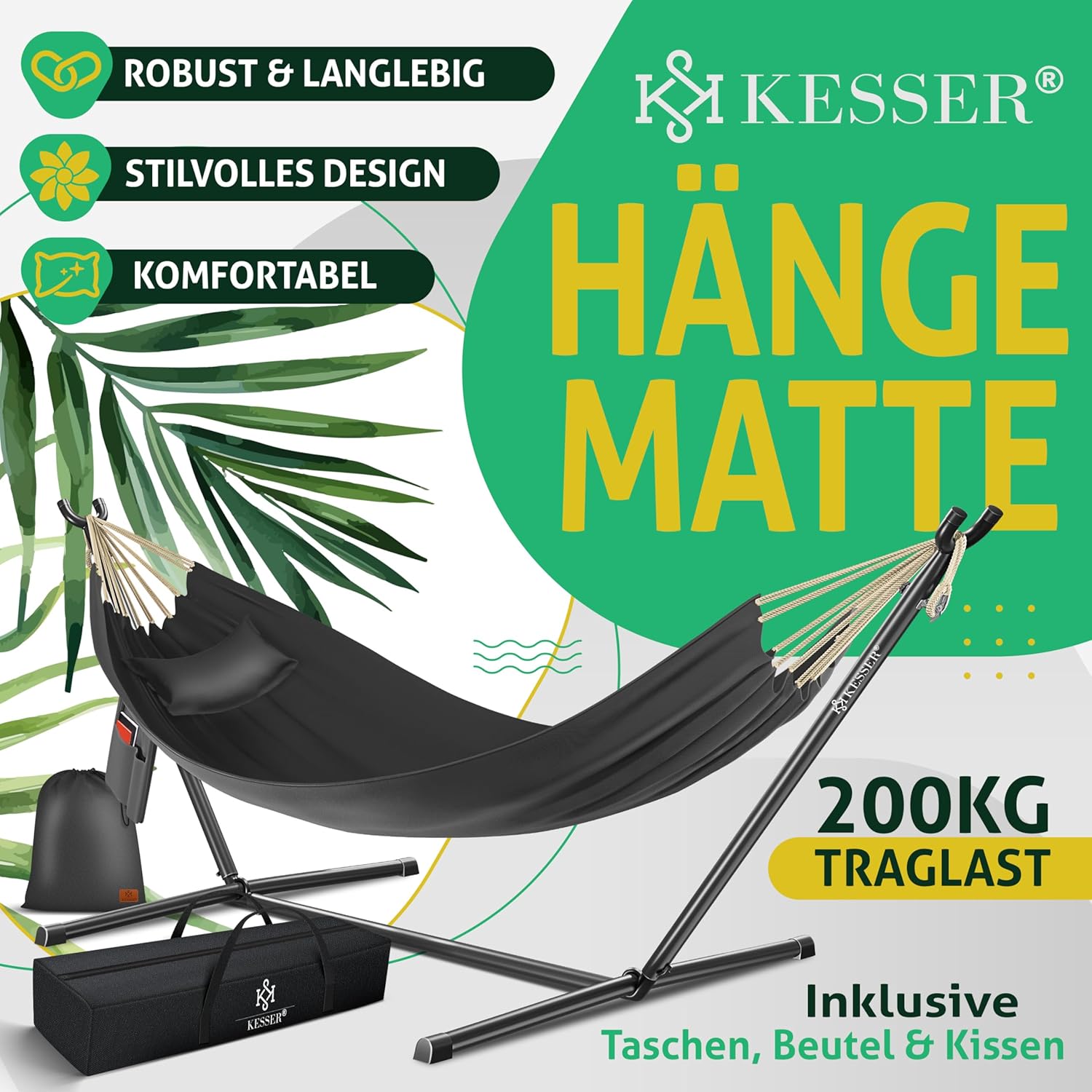 Onze hangstoel met frame van het merk KESSER is een ideaal alternatief voor de traditionele hangmat, die tussen twee vaste punten wordt opgehangen. Juist als je je campinghangmat graag op verschillende plaatsen wilt plaatsen, is ons frame van lichtgewicht staal de optimale keuze Pas de locatie van onze robuuste hangmat snel en gemakkelijk aan je behoeften aan en profiteer van maximaal comfort en flexibiliteit op je balkon, terras, in je tuin, tijdens je strand- of campingvakantie en op vele andere plaatsen. Zo hoef je je geen zorgen meer te maken over een bevestigingsmogelijkheid.
