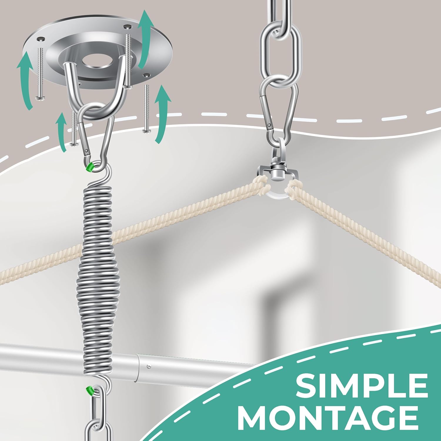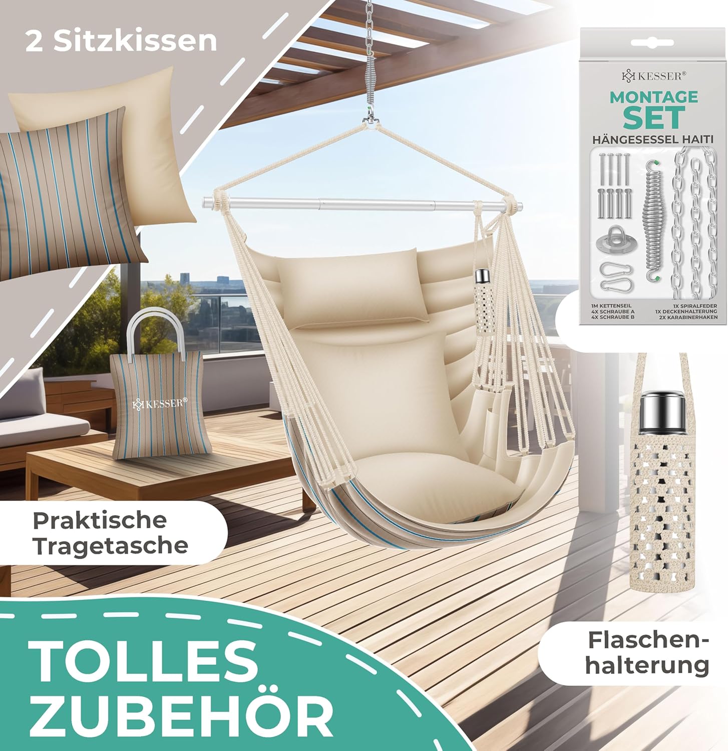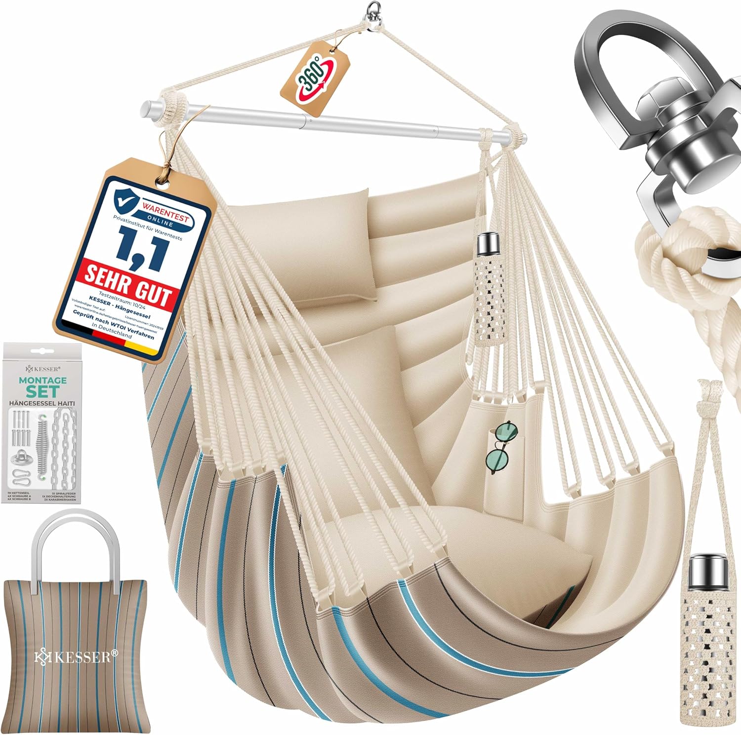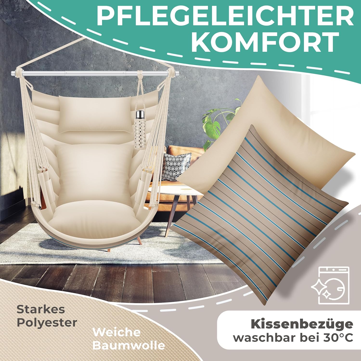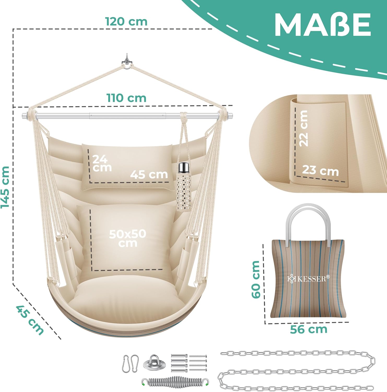 Zeer stabiel en veilig: met een draagvermogen van maximaal 150 kg en een spreidstang met antislip uiteinden biedt de hangstoel maximale veiligheid en stabiliteit. De draaibare ophanging zorgt voor een 360°-bewegingsvrijheid voor ultiem comfort.