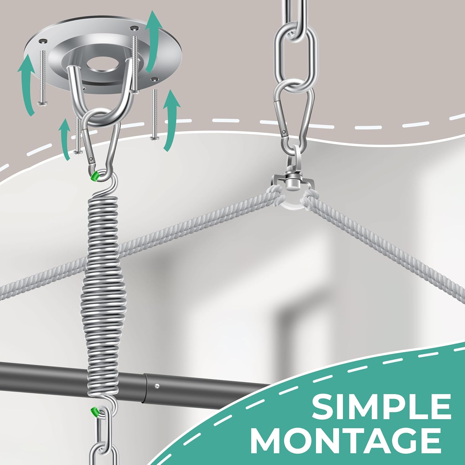 Waarschuwing: maximaal draagvermogen 150 kg. Hangstoel veilig aan stabiele steunen bevestigen. Niet gebruiken zonder spreidstangen. Buiten het bereik van kinderen houden.