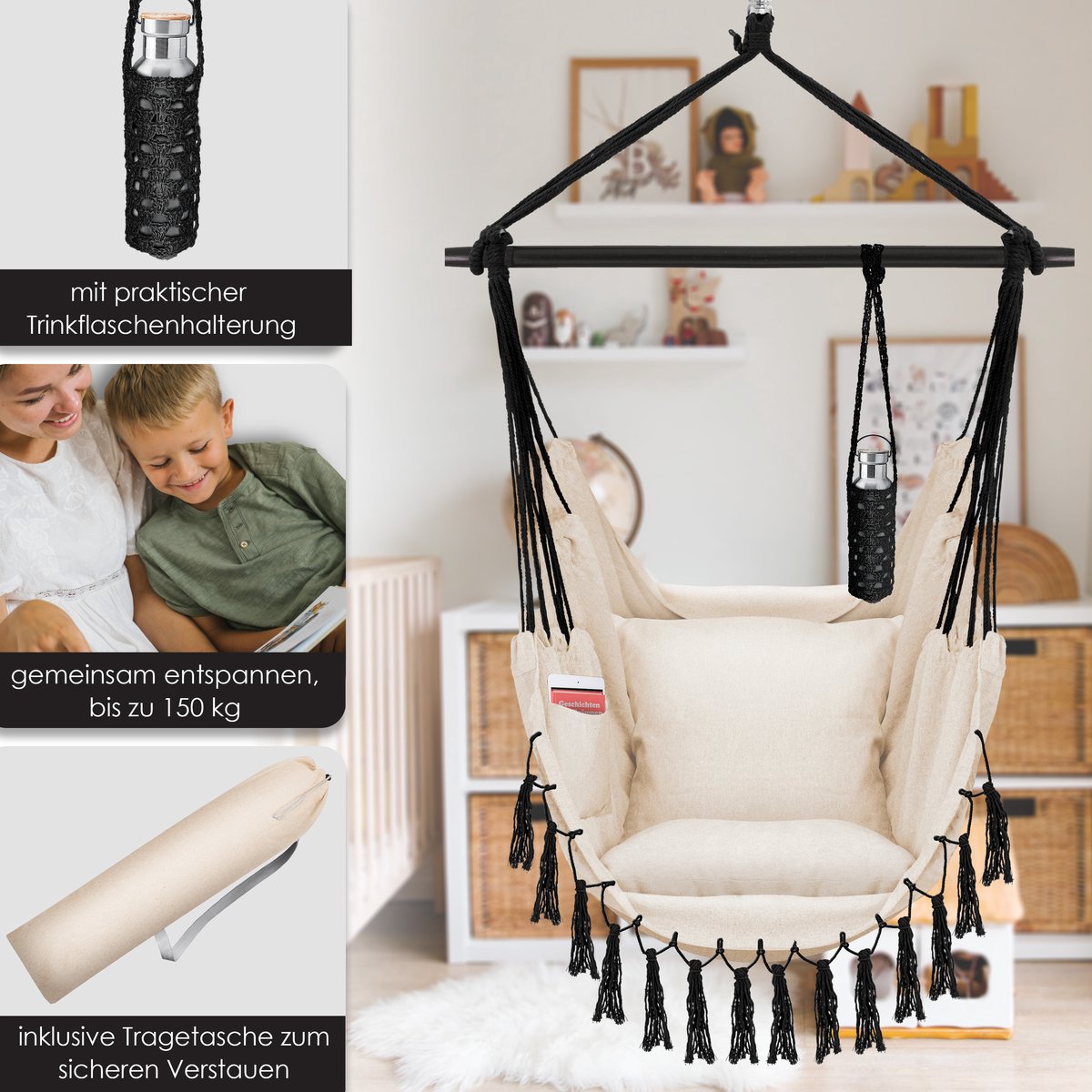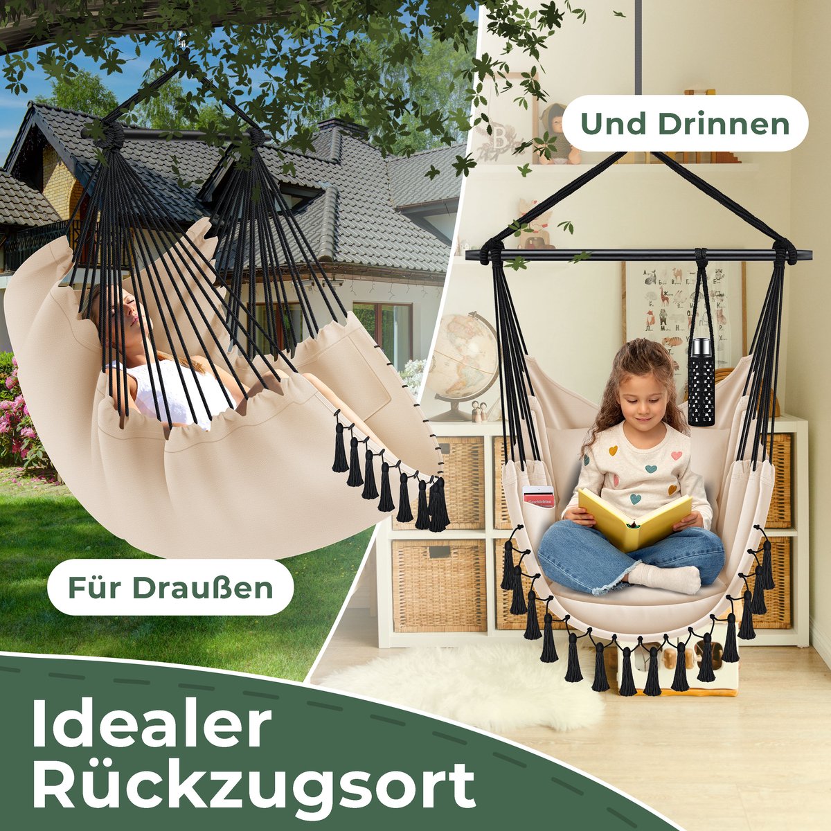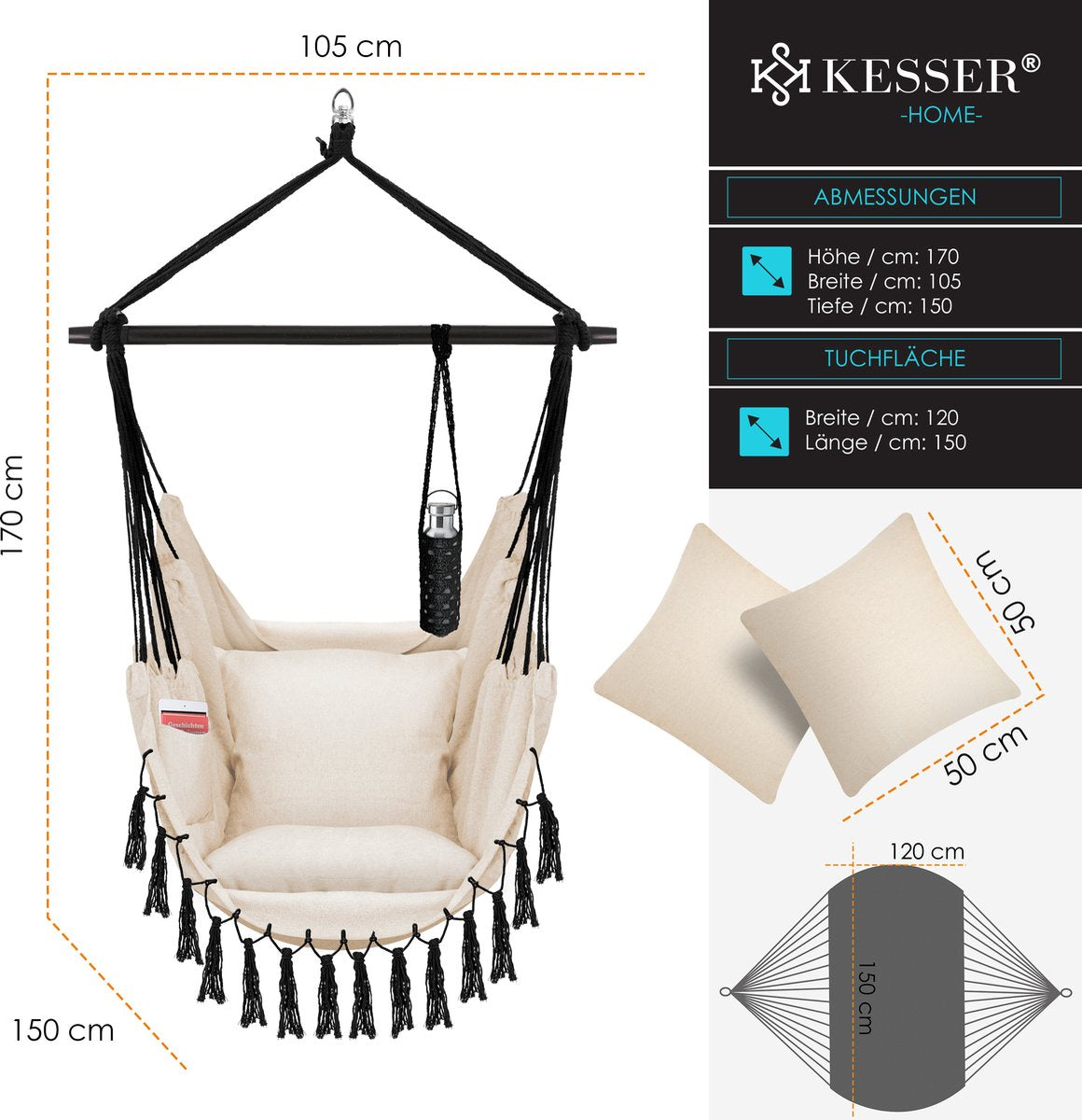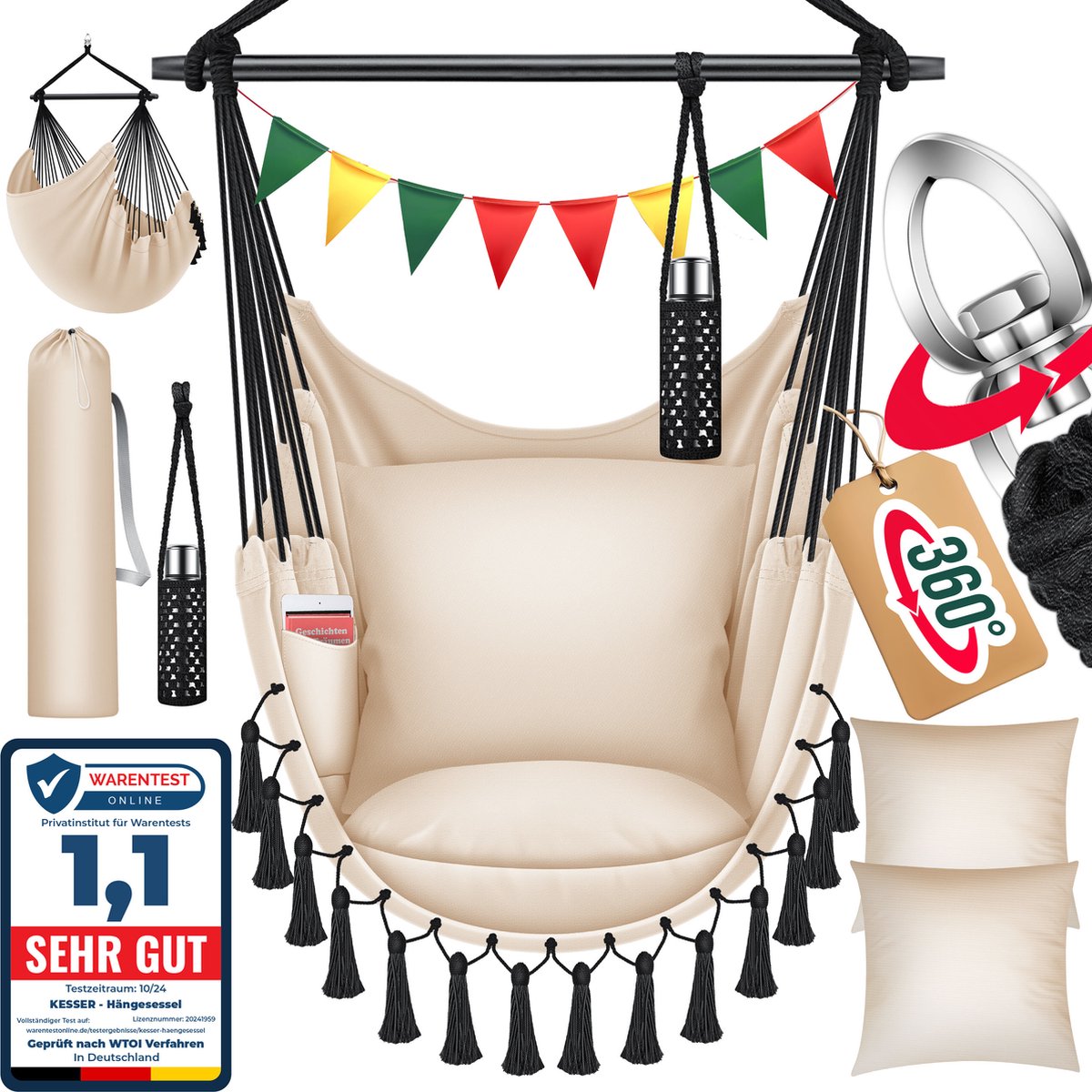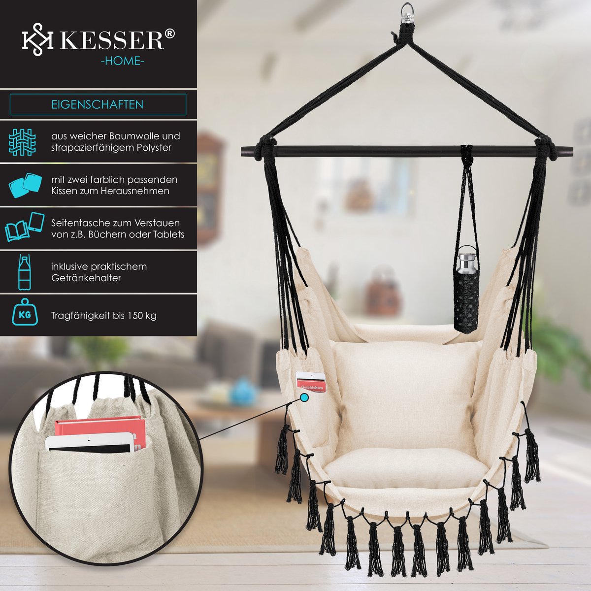 KESSER® Hangstoel met 2 kussens, drankhouder & boekenrek - Safari XXL Hangstoel voor volwassenen & kinderen Hangmat tot 150 kg Hangstoel Ophanging Indoor & Outdoor Wonen & Tuin Terras