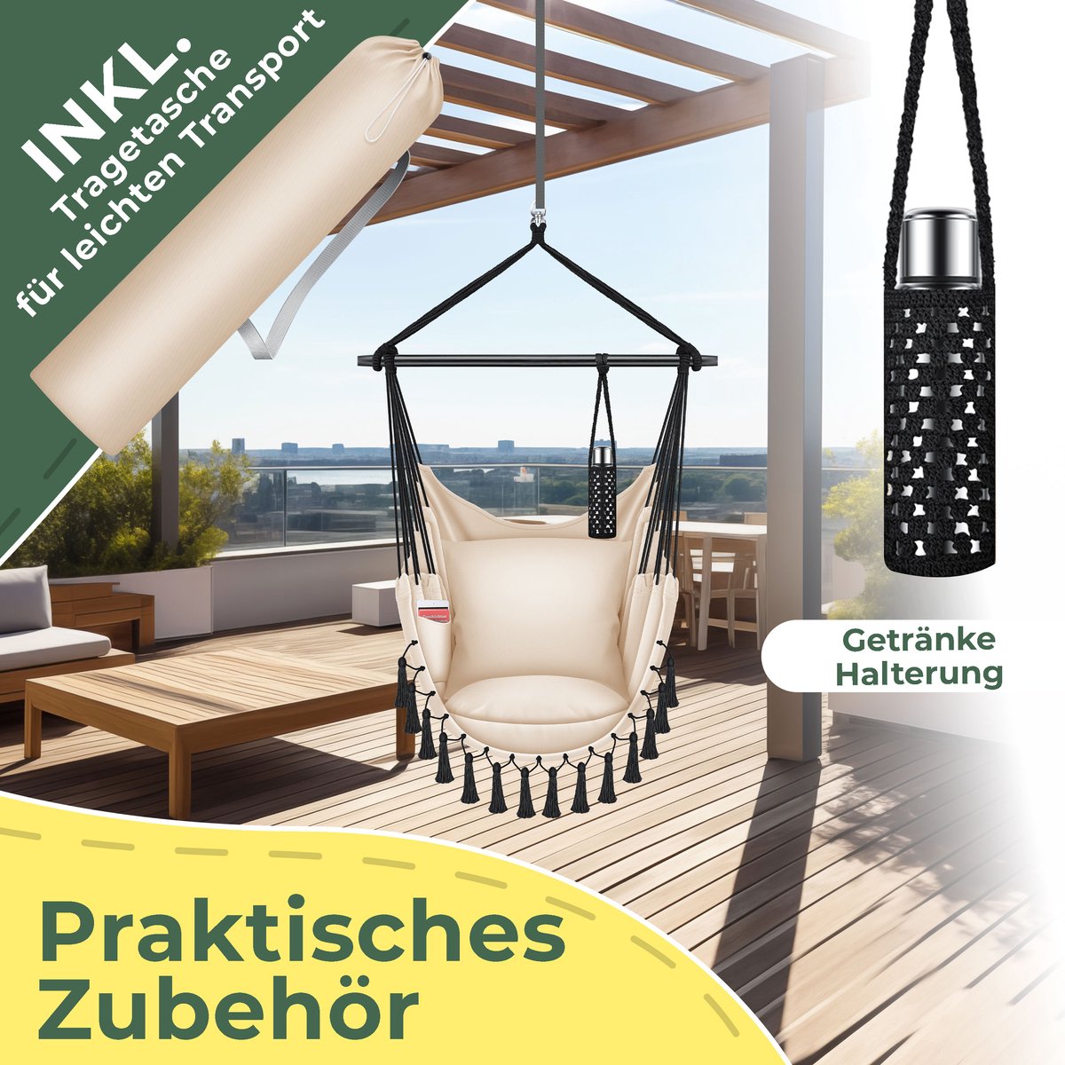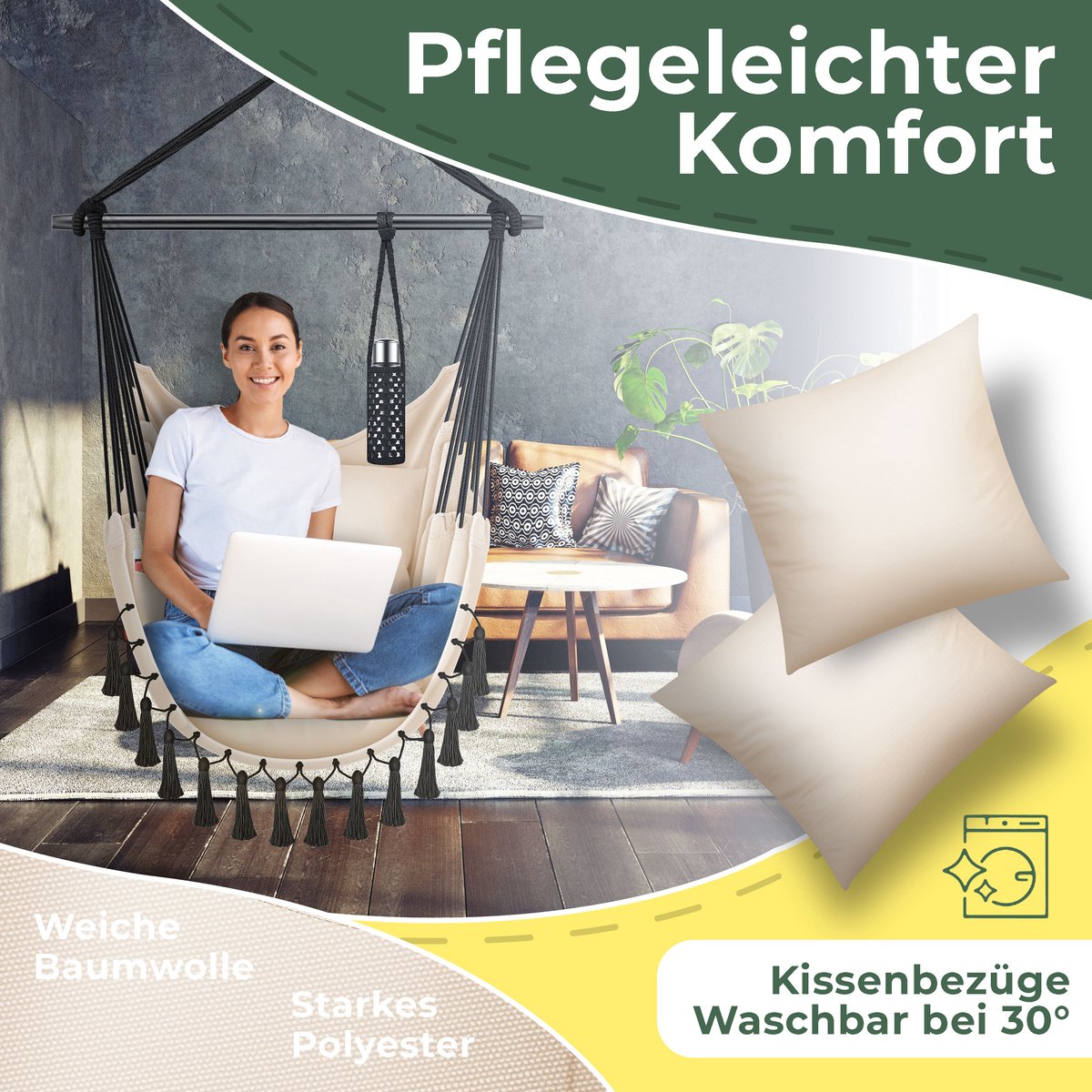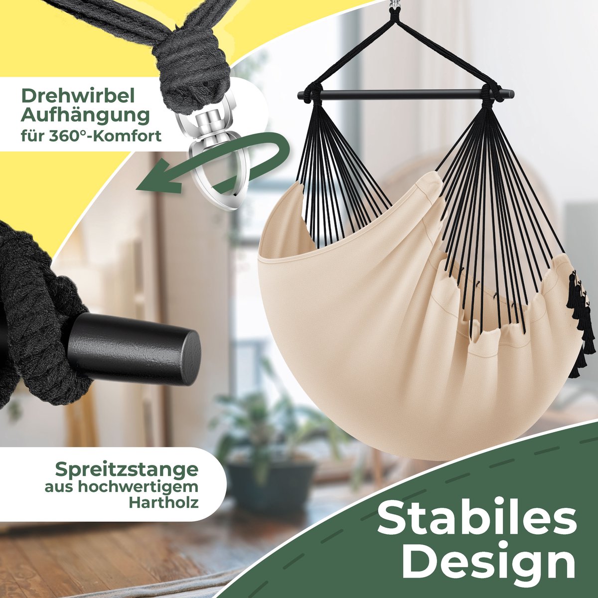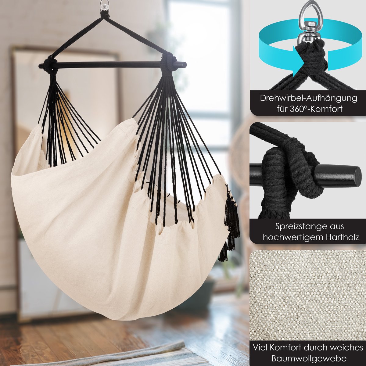 HOOGWAARDIGE VERWERKING: De relaxstoel is gemaakt van zacht katoen en duurzaam polyester - de draaibare ophanging zorgt voor 360° comfort. Samen met de hoogwaardige en robuuste spreidstang van hardhout belooft onze hangmand een langdurig gebruik en een probleemloze belastbaarheid tot maximaal 150 kg. De zitmand is bedekt met een katoenen vlechtwerk dat weerbestendig en duurzaam is: UV-licht, vuil en water kunnen de stoel niets doen.
