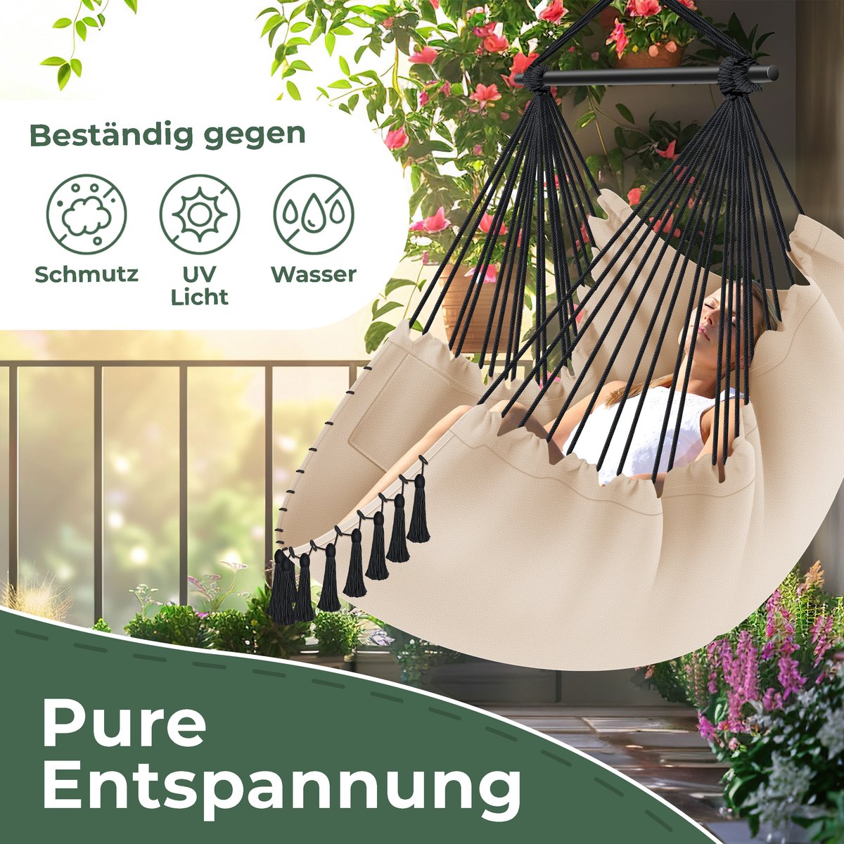 De relaxstoel is gemaakt van zacht katoen en duurzaam polyester - de draaibare ophanging zorgt voor 360° comfort. Samen met de hoogwaardige en robuuste spreidstang van hardhout belooft onze hangmand een langdurig gebruik en een probleemloze belastbaarheid tot maximaal 150 kg.