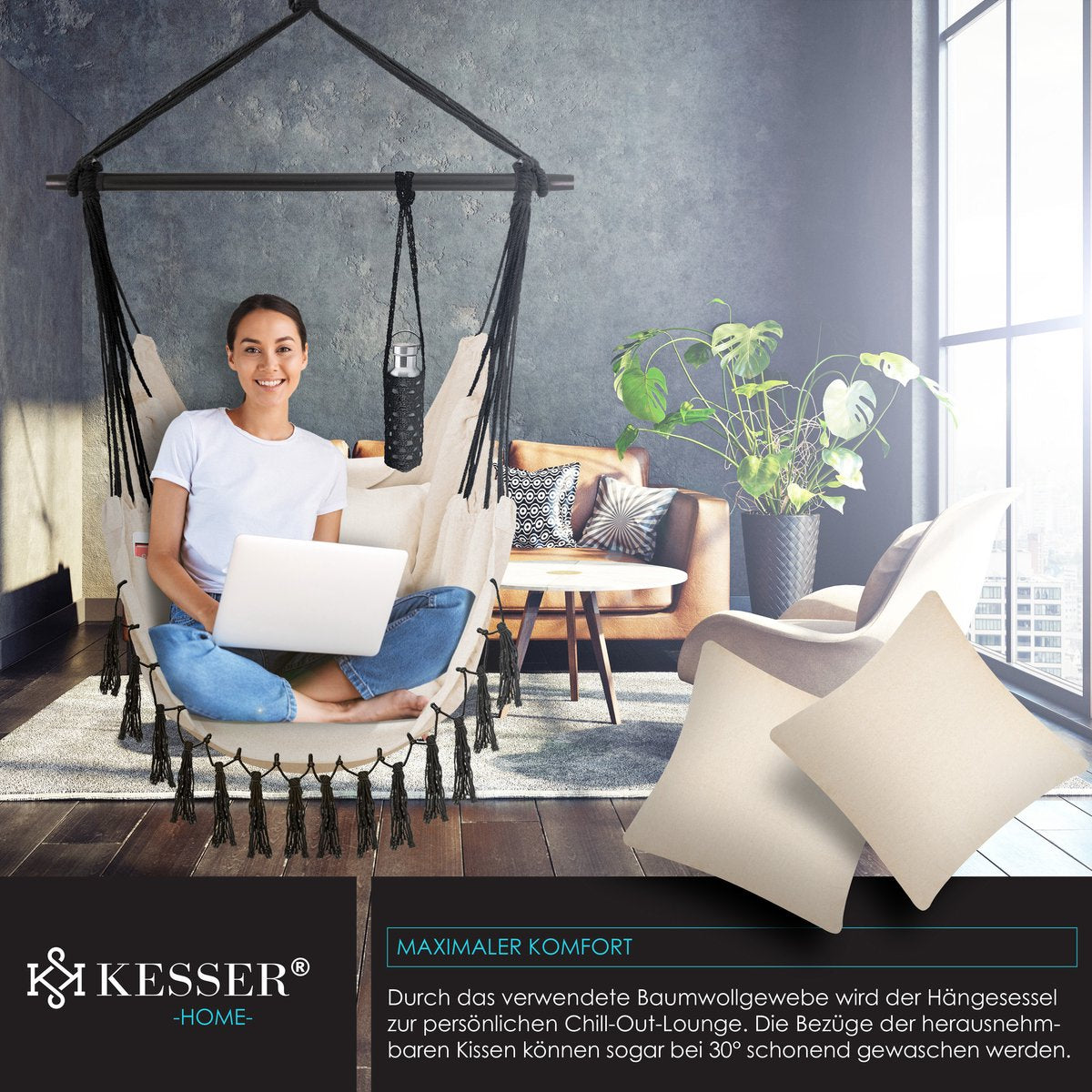 De zitmand is bedekt met katoenen vlechtwerk dat weerbestendig en duurzaam is: UV-licht, vuil en water kunnen jouw comfortabele stoel niets aandoen! Dankzij de vrije ophanging aan een massieve stalen haak kun je zachte schommelbewegingen ervaren in de KESSER hangstoel.