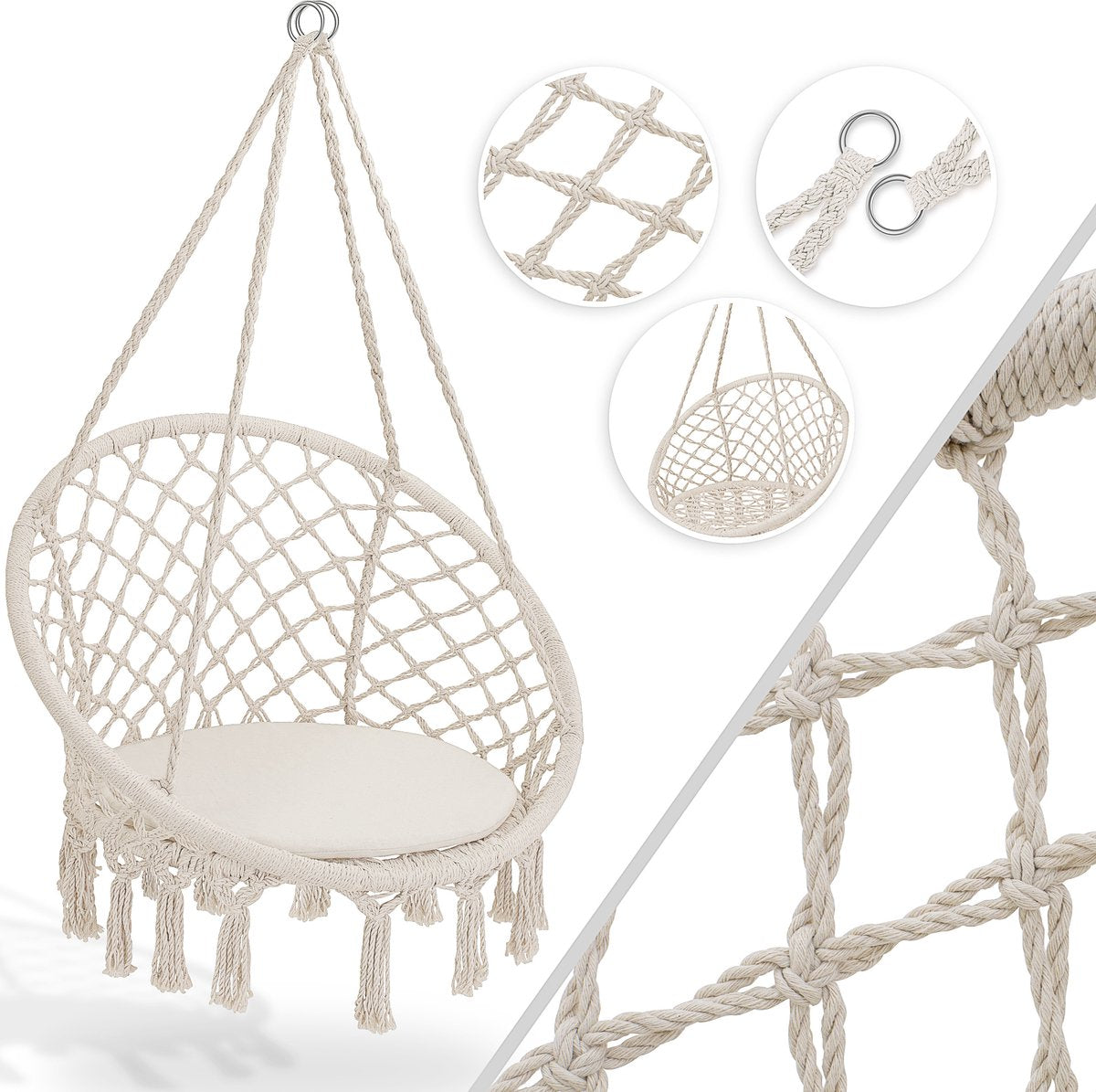 De hangstoel wordt verbonden door 4 touwen met 2 stalen ringen. De maximale belastbaarheid is 150 kg. Het lichte katoenen vlechtwerk en het bijbehorende zitkussen passen zich perfect aan de vorm van je lichaam aan.