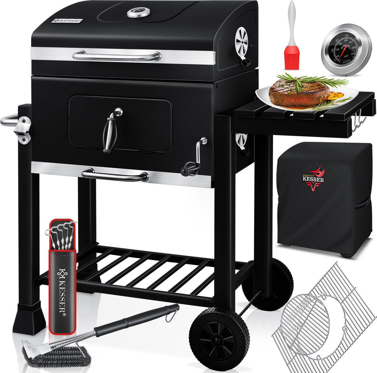 KESSER Master houtskool barbecuetrolley bestaande uit een gepoedercoate vuurschaal, geëmailleerd grillrooster, twee kunststof wielen, geïntegreerde dekselthermometer en een flesopener.