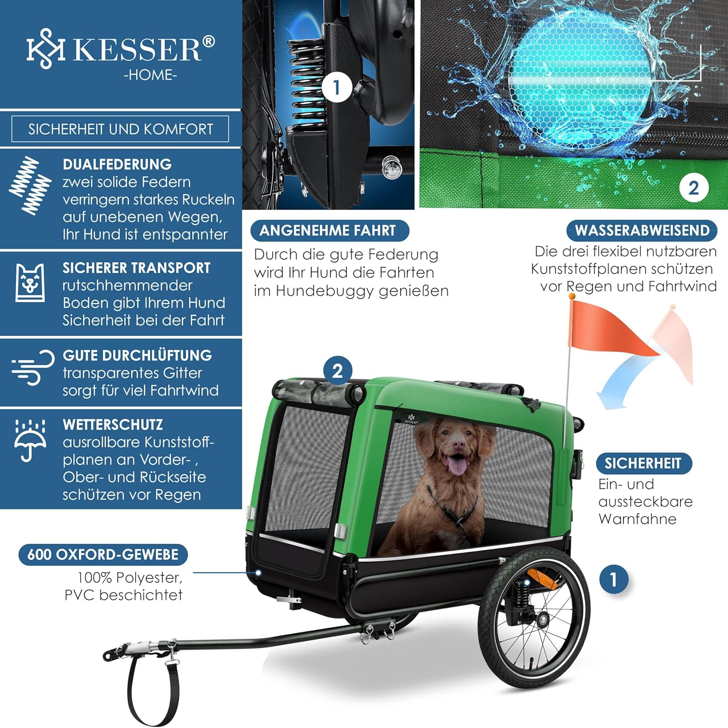 Veiligheid: reflectoren beveiligen je bovendien als het donker wordt en de insteekbare vlag maakt je goed zichtbaar bij slecht weer. Het meegeleverde veiligheidsharnas zorgt ervoor dat je hond tijdens het rijden veilig is aangelijnd en voorkomt ongelukken door hastige bewegingen. Ook bij oneffen wegen of routes profiteren jij en je lieveling van de hoogwaardige vering en het goed geventileerde gaasrooster waardoor je racker ook de omgeving kan zien