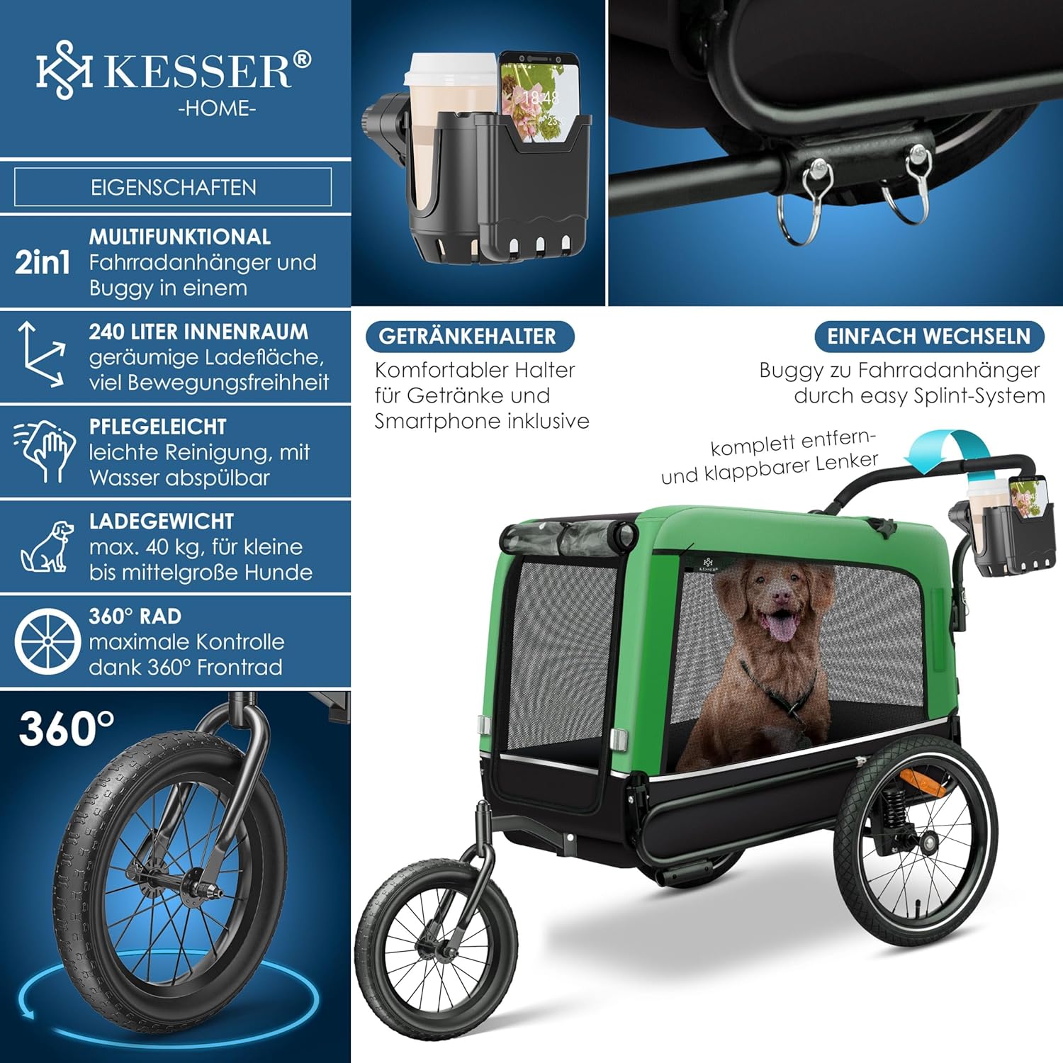 Multifunctioneel en praktisch: zoals de naam al aangeeft, kan de hondenbuggy en jogger op twee verschillende toepassingsgebieden overtuigen, bovendien is hij ook geschikt als fietsaanhanger. Dankzij sleuven voor dissel, voorwiel en duwstang is een verandering met weinig moeite snel en eenvoudig mogelijk. Met de hondenaanhanger inclusief drank- en smartphonehouder kun je onderweg je drankjes en smartphone gemakkelijk binnen handbereik hebben.