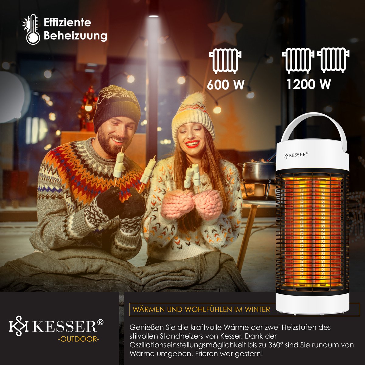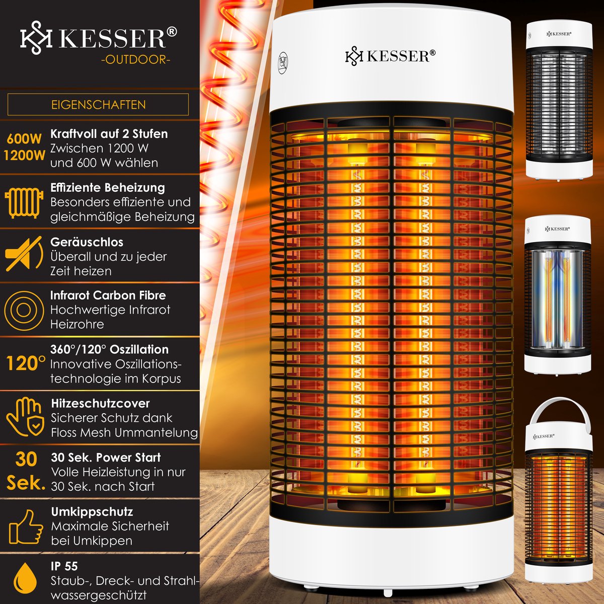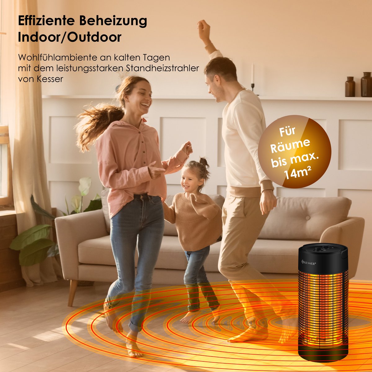 KESSER vloerverwarmer met twee krachtige standen voor efficiënte en gelijkmatige verwarming dankzij hoogwaardige infraroodverwarmingsbuizen, 120°-360° oscillatie en geruisloos, hittebeschermingshoes, volledig verwarmingsvermogen in slechts 30 seconden, kantelbeveiliging en IP 55-bescherming.