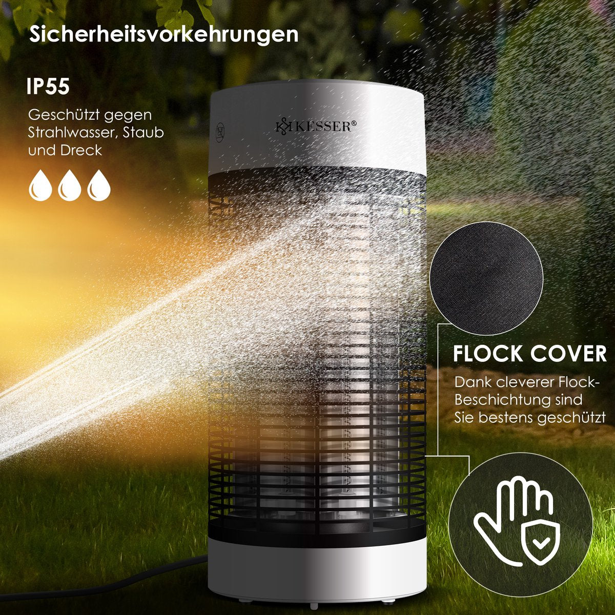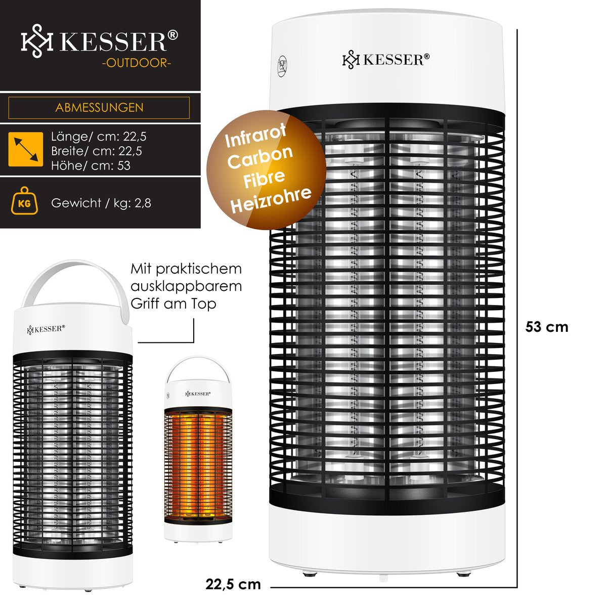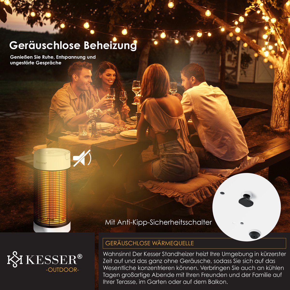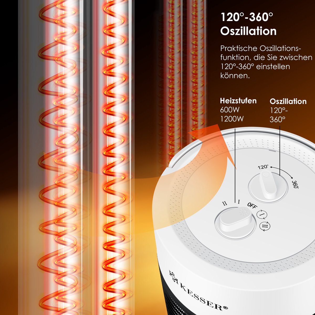 KESSER vloerverwarmer met twee krachtige standen voor efficiënte en gelijkmatige verwarming dankzij hoogwaardige infraroodverwarmingsbuizen, 120°-360° oscillatie en geruisloos, hittebeschermingshoes, volledig verwarmingsvermogen in slechts 30 seconden, kantelbeveiliging en IP 55-bescherming.