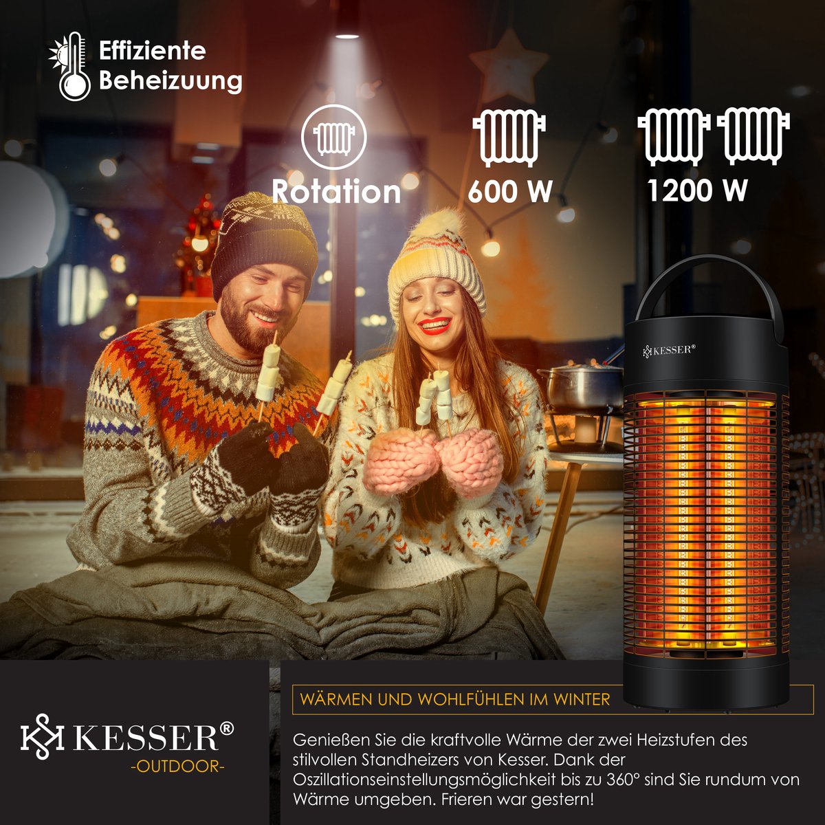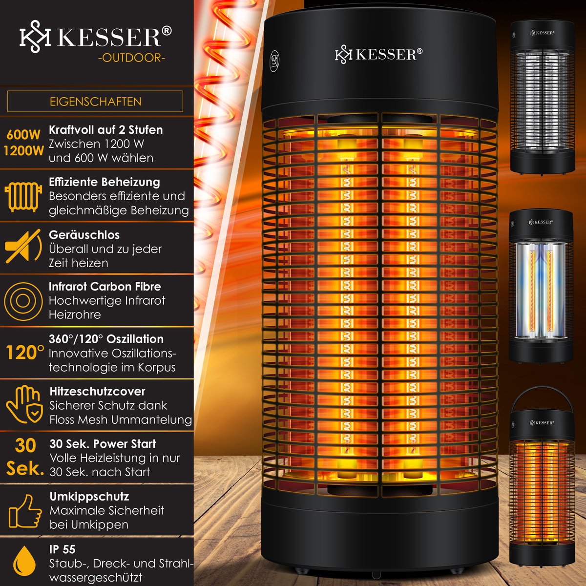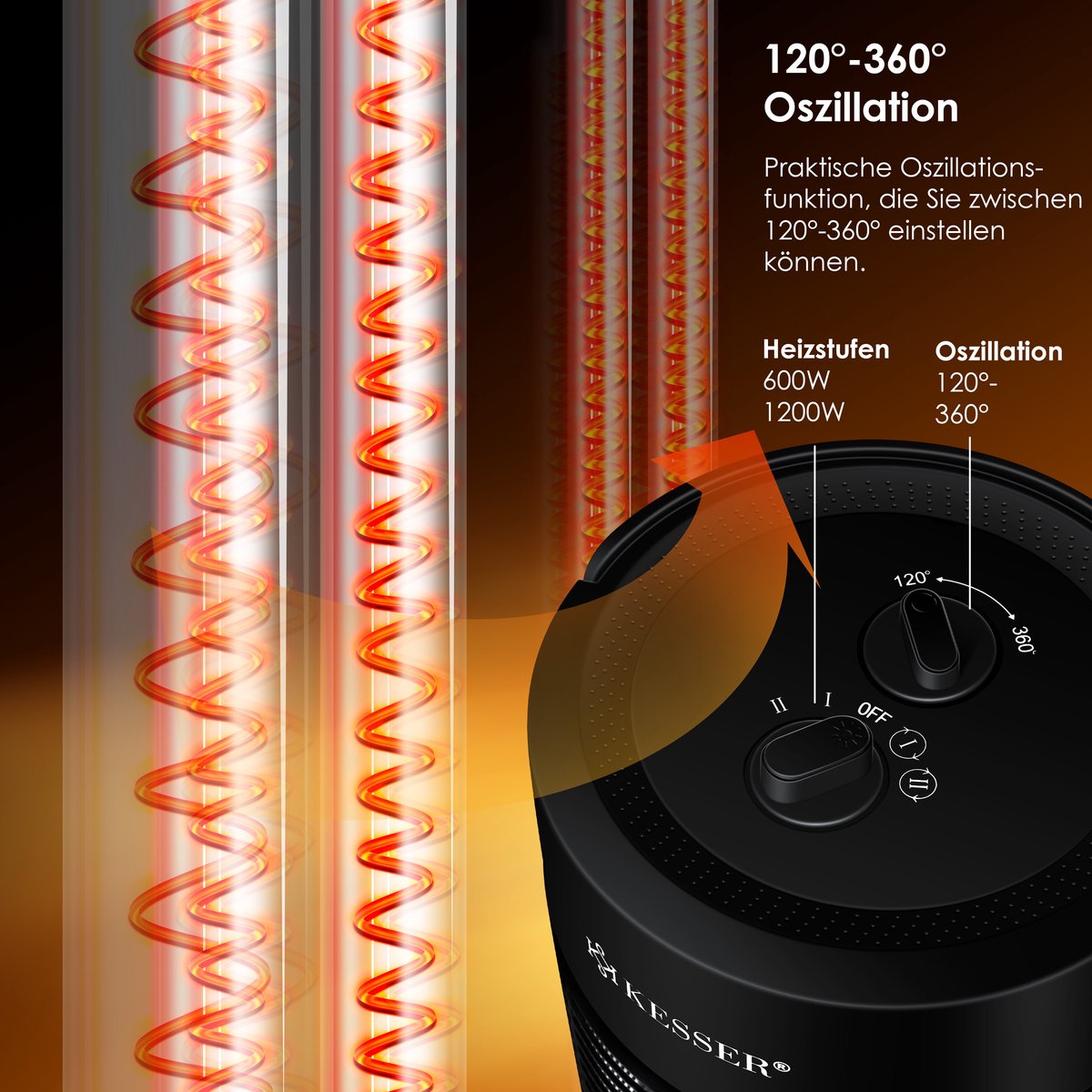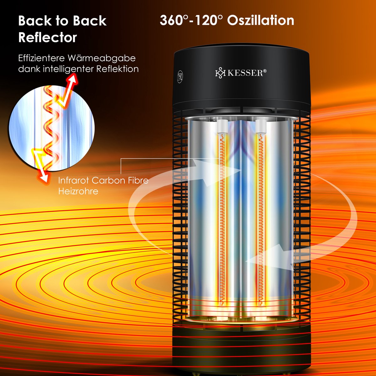 KESSER vloerverwarmer met twee krachtige standen voor efficiënte en gelijkmatige verwarming dankzij hoogwaardige infraroodverwarmingsbuizen, 120°-360° oscillatie en geruisloos, hittebeschermingshoes, volledig verwarmingsvermogen in slechts 30 seconden, kantelbeveiliging en IP 55-bescherming.