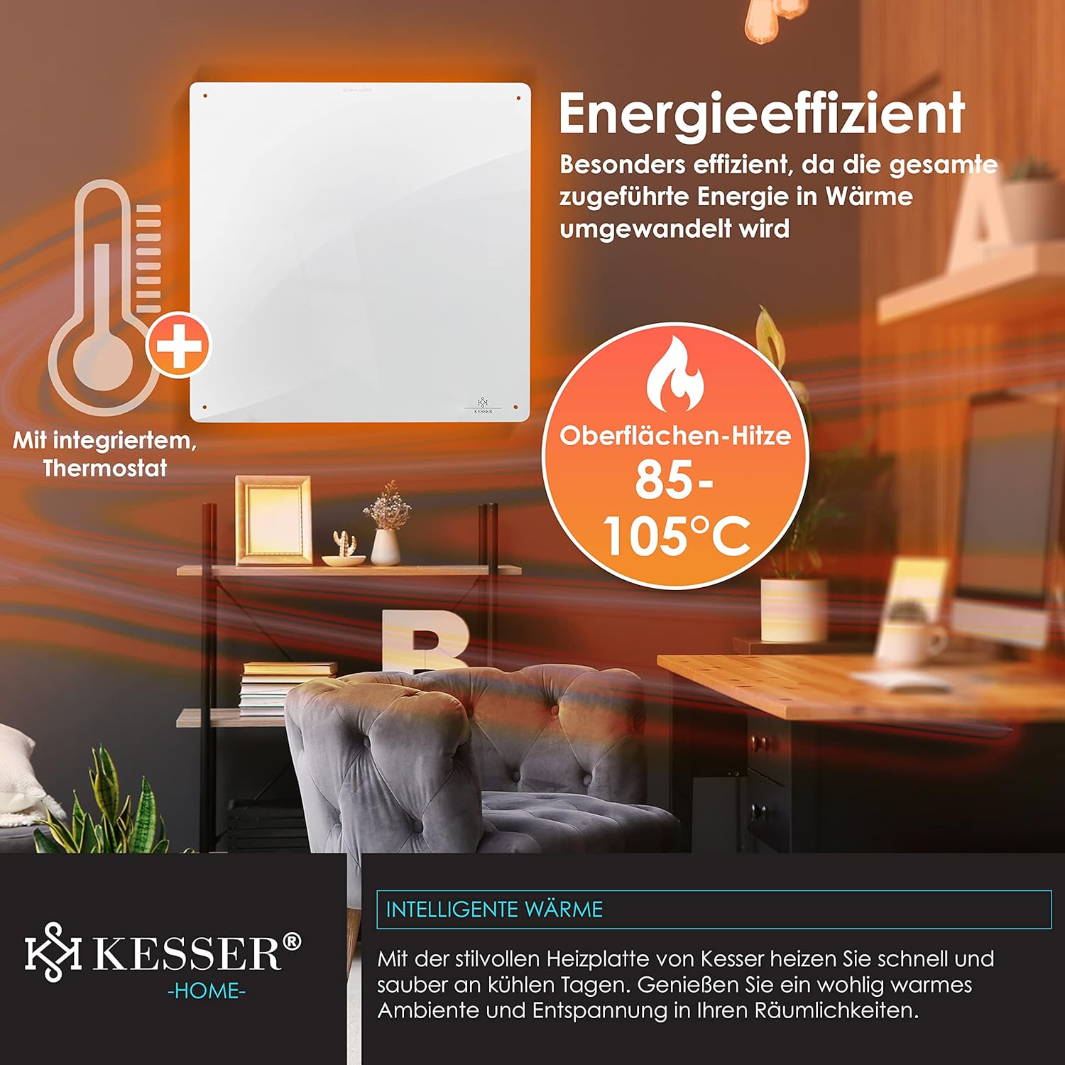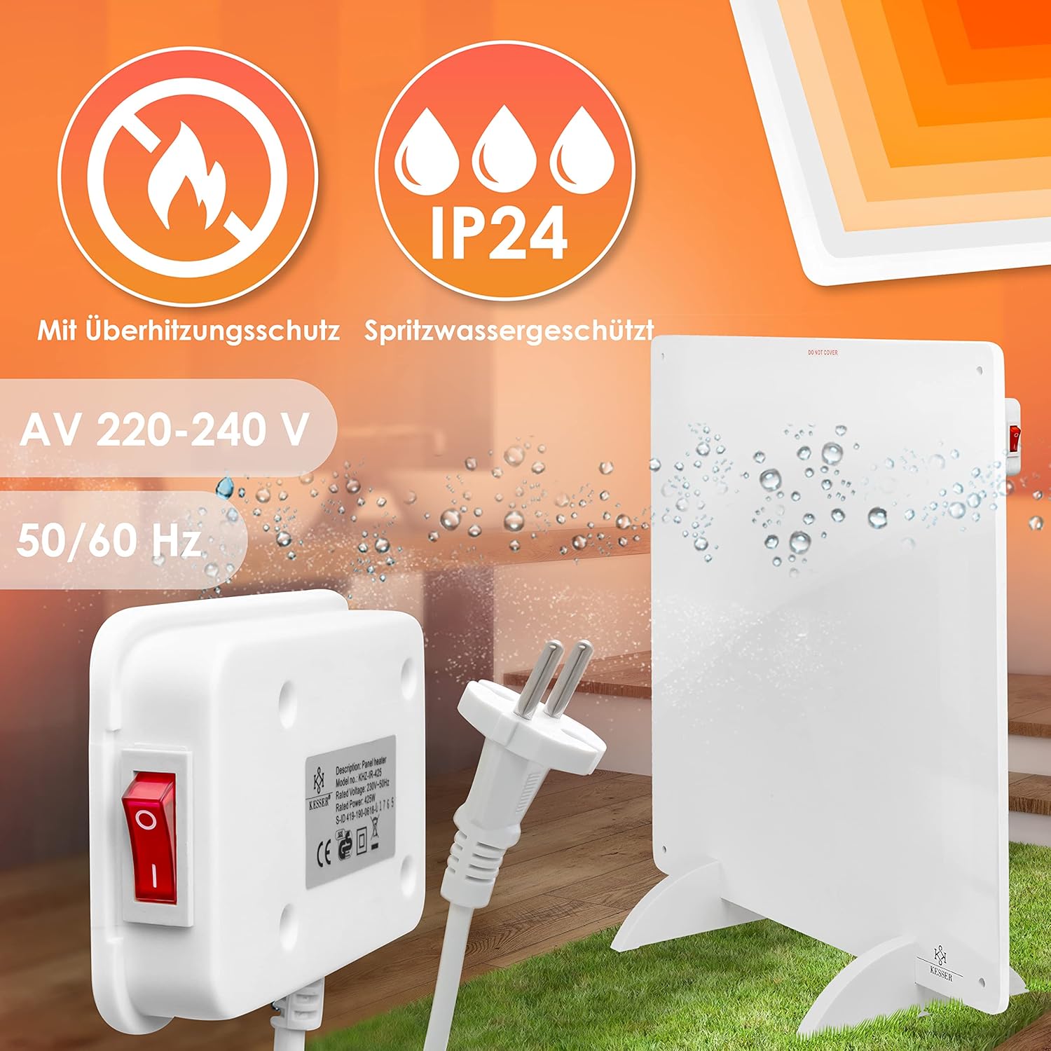 Kleur: wit. Materiaal: keramiek. Kabellengte: 1,5 m. Afmetingen: 60 x 60 x 1 cm. Maximaal vermogen: 425 W. Nominaal vermogen: 400 W. Spanning/frequentie: AC 220 ~ 240 V, 50/60 Hz. Oppervlaktetemperatuur: 70 °C ~ 95 °C. Met aan/uit-schakelaar. Veiligheidsklasse: IP 24 Een ingebouwde thermostaat voor het behoud van de maximale temperatuur (ongeveer 95 °C), oververhittingsbeveiliging, gelakt, wandradiator, GS-getest (geteste veiligheid)