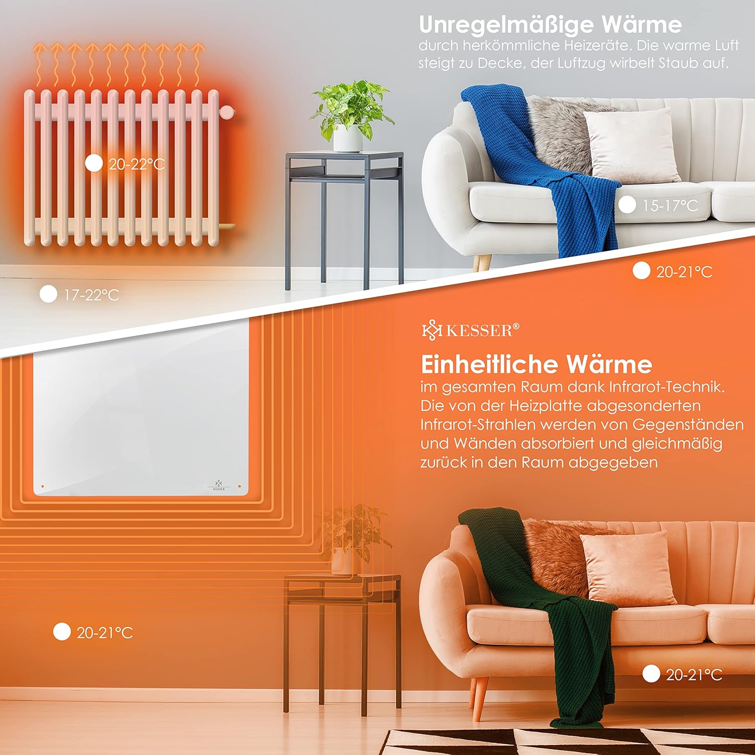 Infrarood radiatoren zijn veel efficiënter, energiezuiniger en energiezuiniger dan conventionele radiatoren. Conventionele radiatoren gebruiken altijd lucht om de warmte te transporteren. Infrarood radiatoren functioneren daarentegen net als de zon. De verwarmingsgolven worden direct op elk vast materiaal in de kamer overgedragen. Op deze manier wordt veel energie bespaard. Bovendien is deze IR-radiator zeer eenvoudig met de montagetoebehoren te installeren. Hij is ook eenvoudig te gebruiken en te reinigen.