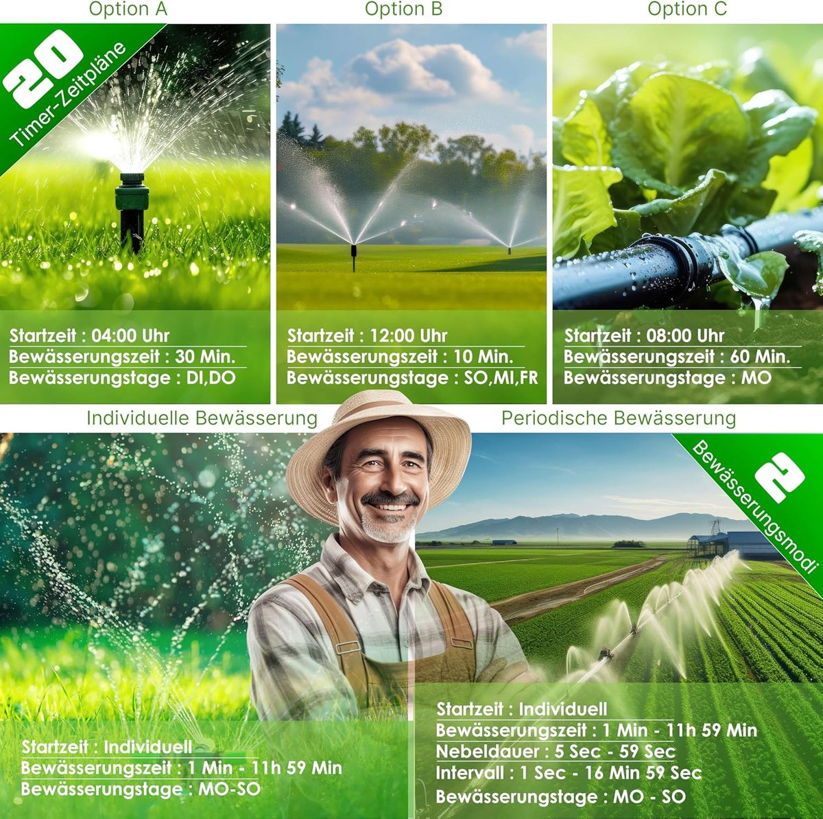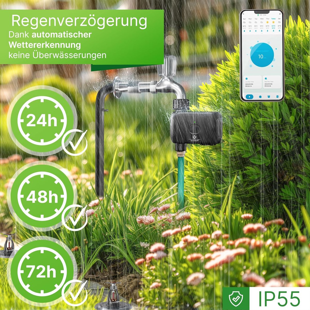 Optimale weerverplaatsing: dankzij de geïntegreerde regensensor past de irrigatiecomputer zich automatisch aan de huidige weersomstandigheden aan. Als er regen wordt gedetecteerd, stopt de irrigatiecomputer automatisch de irrigatie om overbewatering te voorkomen en water te besparen. Deze intelligente functie zorgt voor een efficiënte en duurzame irrigatie van je planten.