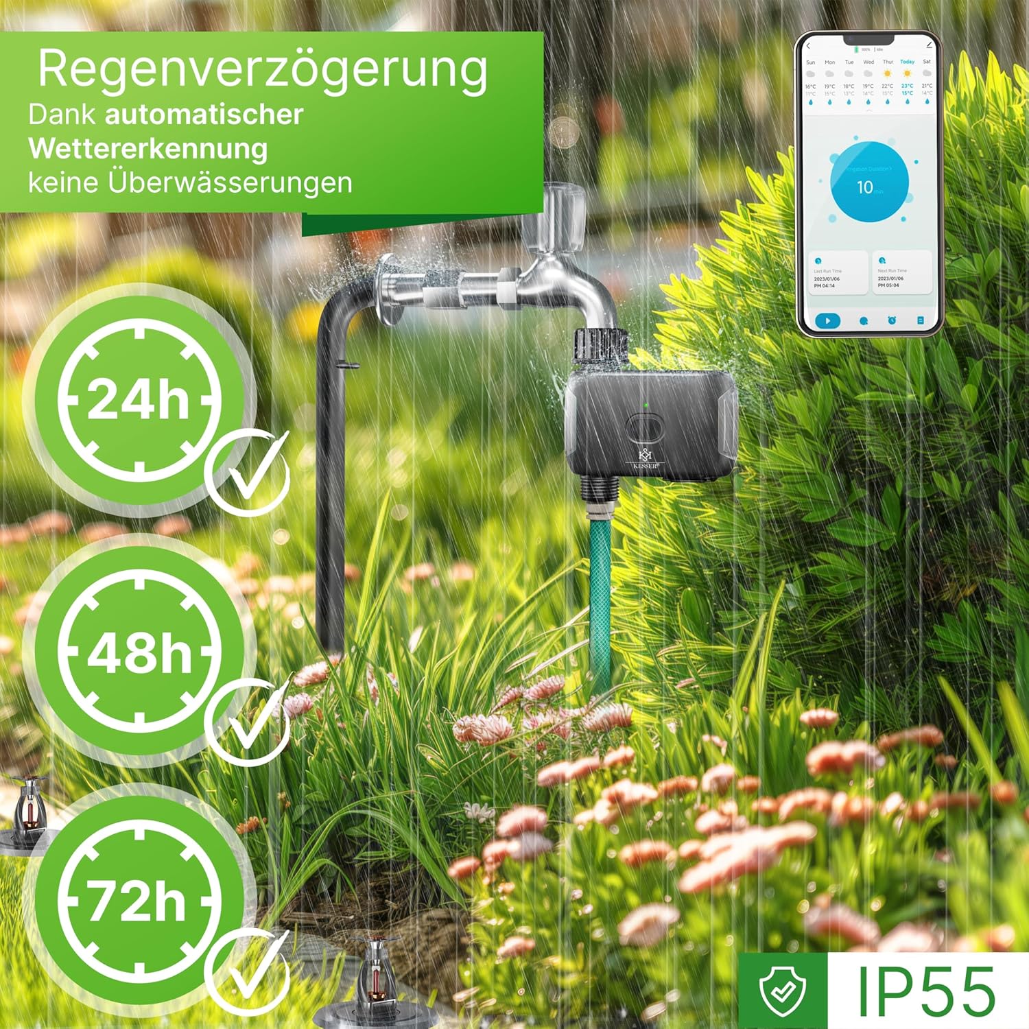 • Optimale weerverplaatsing: dankzij de geïntegreerde regensensor past de irrigatiecomputer zich automatisch aan de huidige weersomstandigheden aan. Als er regen wordt gedetecteerd, stopt de irrigatiecomputer automatisch de irrigatie om overbewatering te voorkomen en water te besparen. Deze intelligente functie zorgt voor een efficiënte en duurzame irrigatie van je planten.