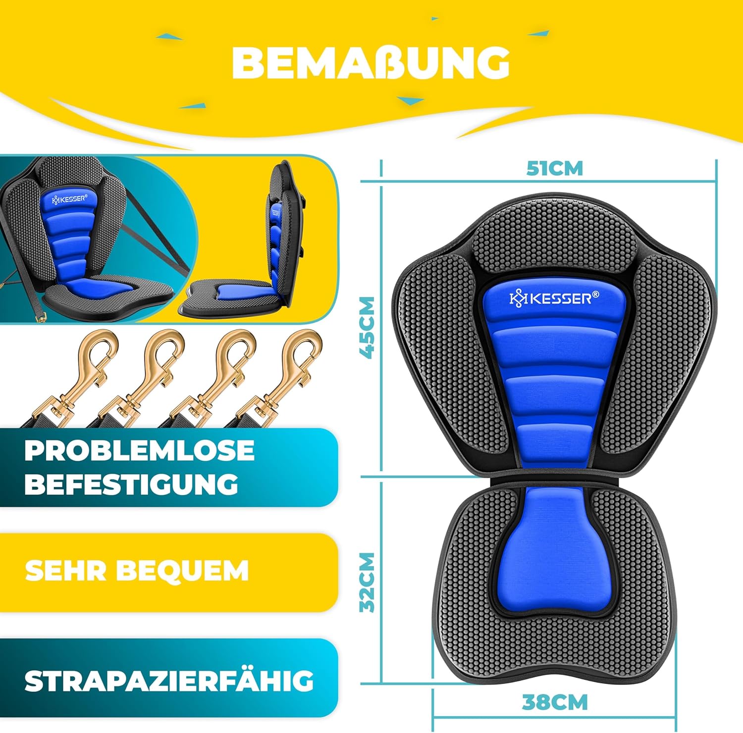- Zitoppervlak: de zitting heeft de afmetingen zitting 32 x 38 cm, rugleuning 51 x 45 cm. Het zachte schuim is aangenaam en de overtrek kan eenvoudig worden gereinigd. Rugleuning en basis zijn royaal gevoerd voor veilig waterplezier