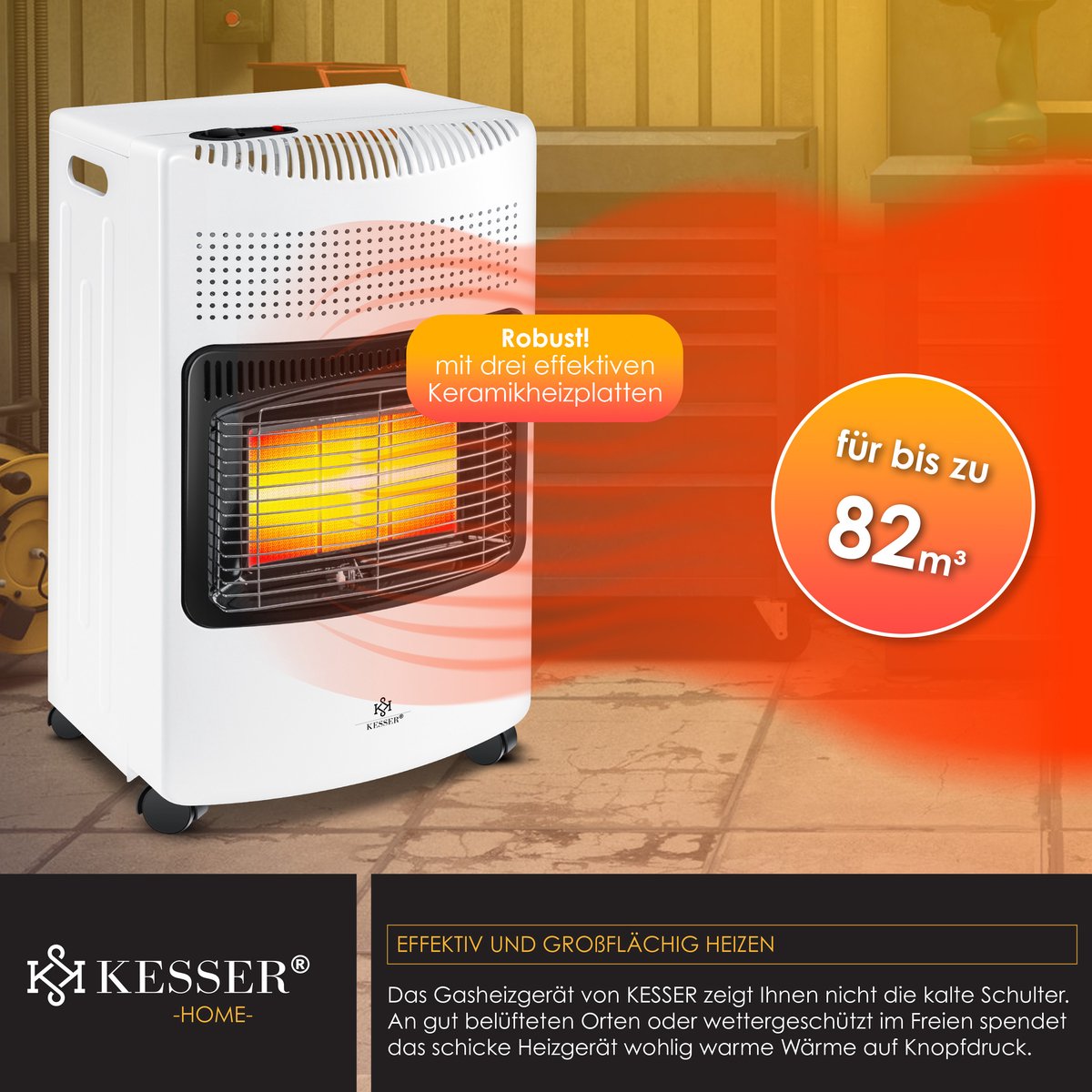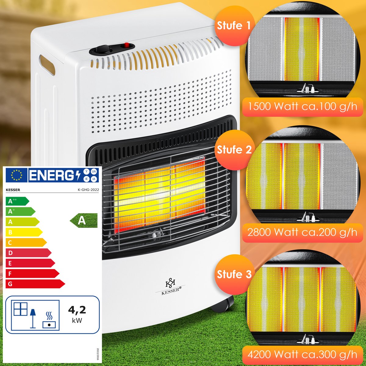 KESSER gasverwarmingsoven met 3 verwarmingsstanden van 1500W, 2800W en 4200W, hoogwaardige afwerking, inclusief drukregelaar en standaardslang, geschikt voor gasflessen tot 15 kg, piëzo-elektrische ontsteking met ODS-apparaat, laag verbruik, 360° wielen.