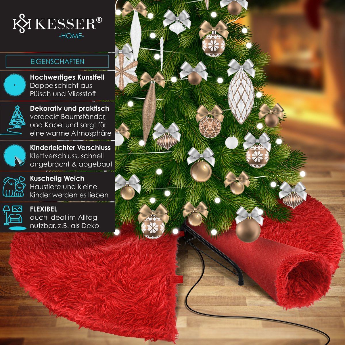 KESSER Kerstboomrok van hoogwaardig kunstbont, verbergt kabels en boomstandaard voor een warme sfeer, snel te bevestigen dankzij klittenband, flexibel te gebruiken als decoratie.