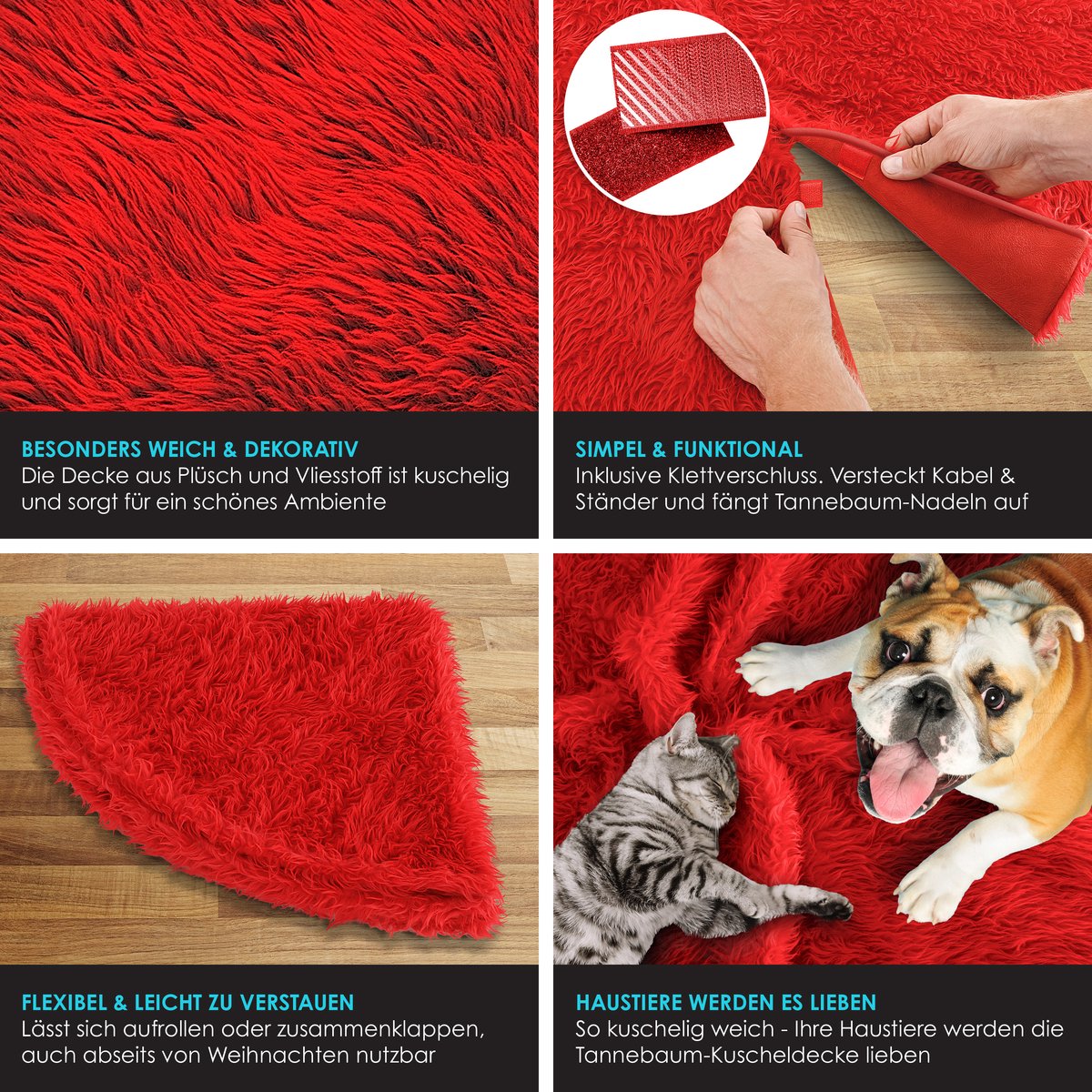 Onze kerstboomrok is gemaakt van extra zachte fleece stof, waardoor hij extra knus en zacht is.Daarom zullen je huisdieren ook dol zijn op de kerstdecoratie.Door de sterke kleur creëert de deken een prachtige sfeer en kan daarom ook buiten de kerstperiode als decoratie worden gebruikt.Bijvoorbeeld om je huis te versieren of als feestdecoratie, als sprei of zelfs in de kinderkamer.Als je de kerstdeken niet gebruikt , kan hij worden opgerold of opgevouwen.