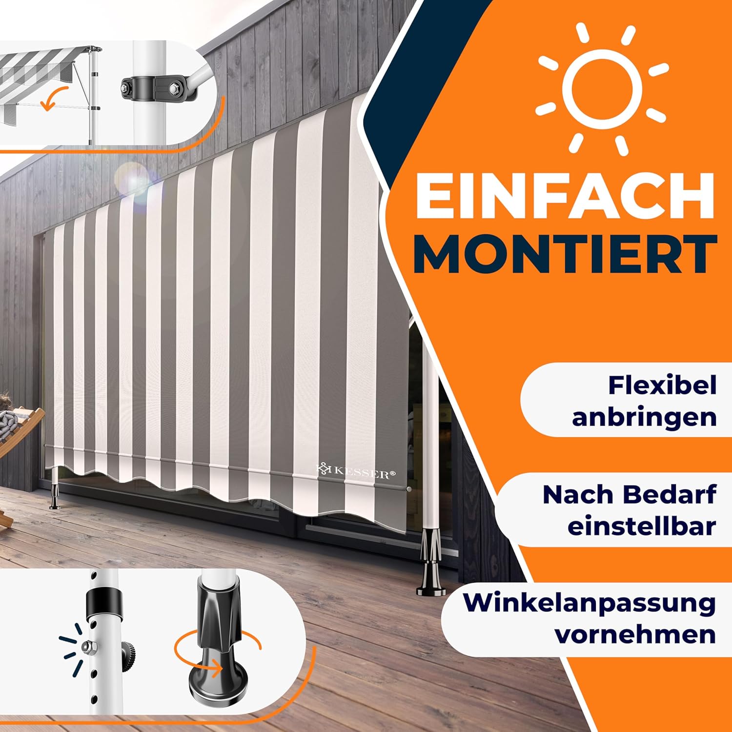 • Zicht- en zonbescherming: onze KESSER klemluifel biedt de ideale bescherming voor warme zomerdagen op balkon, terras, tuin, serre of ramen tegen direct zonlicht. De inkijkbescherming beschermt je tegen de nieuwsgierige blikken van je buren, ontbijt in alle rust op je terras en geniet gewoon van je privacy.