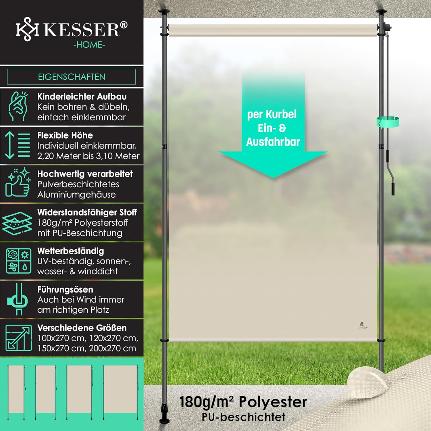 Comfortabel en veilig: met de verticale luifel KESSER kun je buiten genieten van eersteklas comfort. De eenvoudige montage zonder boren en pluggen, de robuuste constructie en de maximale flexibiliteit maken je outdoor-ervaringen stressvrij en ontspannen. Investeer in kwaliteit en beleef zorgeloze uren buiten met de verticale luifel. KESSER.