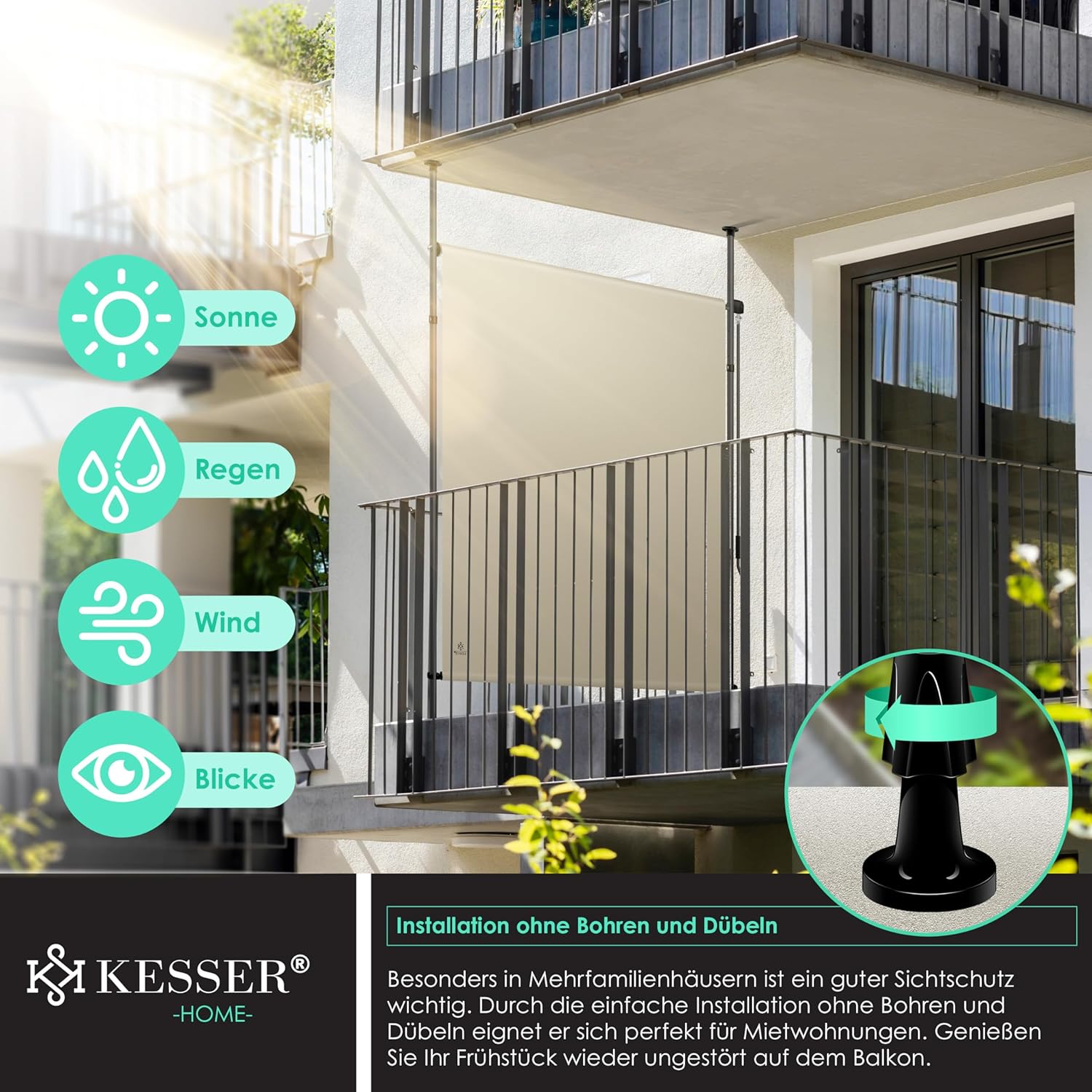 Veelzijdige toepassingen: de verticale luifel KESSER is veelzijdig en is ideaal voor balkons, terrassen en tuinen. Het biedt niet alleen effectieve bescherming tegen inkijk en wind, maar creëert ook een privésfeer buitenshuis. Dankzij de weer- en uv-bestendigheid is hij het hele jaar door te gebruiken en geeft hij je buitenruimte een vleugje luxe en comfort.