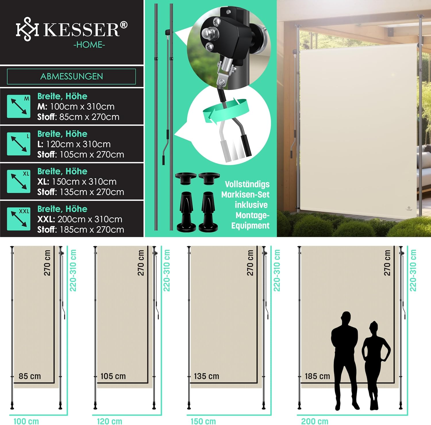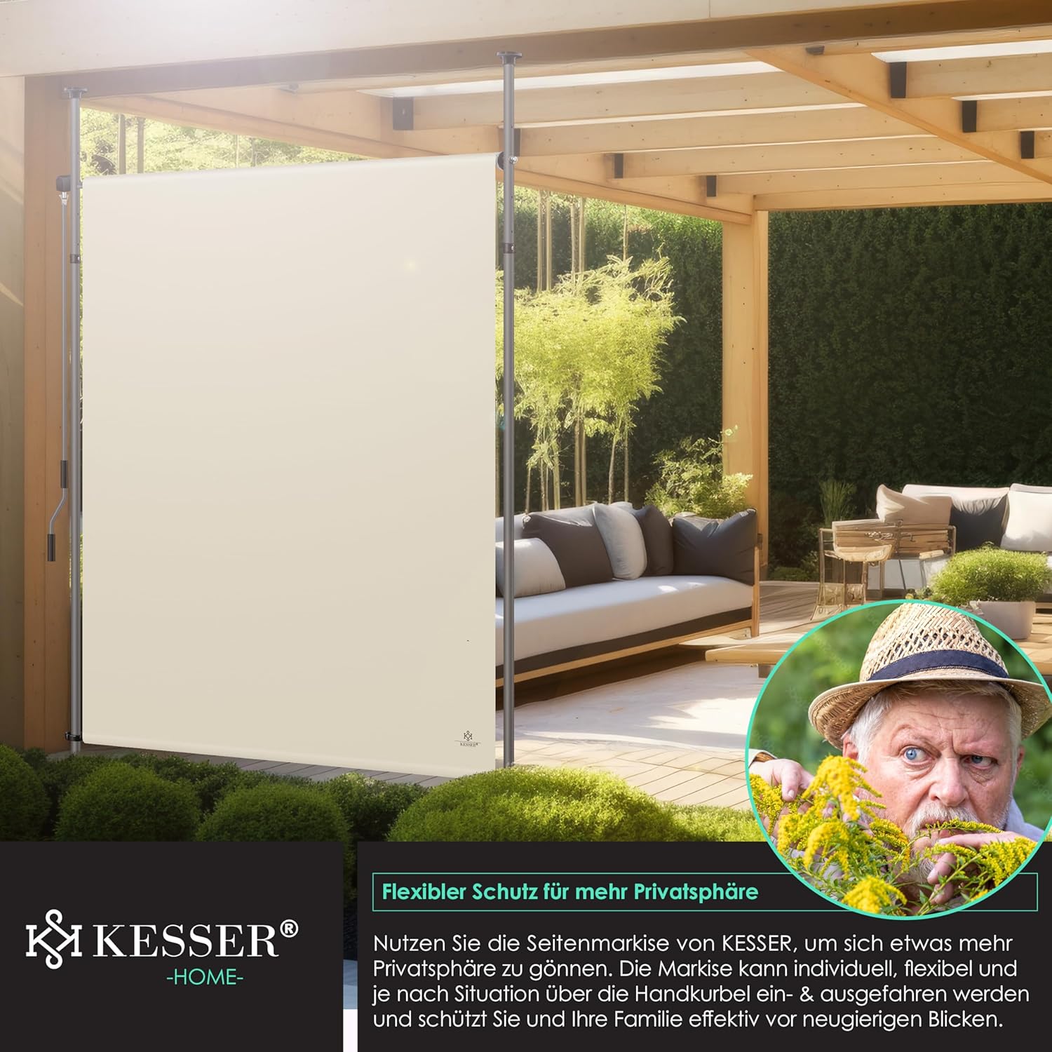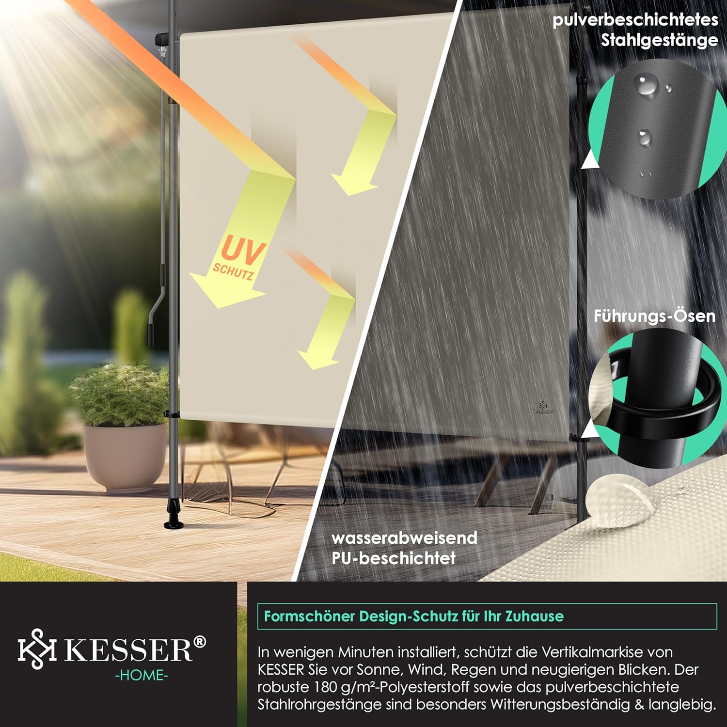 Mit der Vertikalmarkise KESSER können Sie erstklassigen Komfort im Freien genießen. Der einfache Aufbau ohne Bohren und Dübeln, die robuste Konstruktion und die maximale Flexibilität machen Ihre Outdoor-Erlebnisse stressfrei und entspannt. Investieren Sie in Qualität und erleben Sie unbeschwerte Stunden im Freien mit der Vertikalmarkise KESSER.