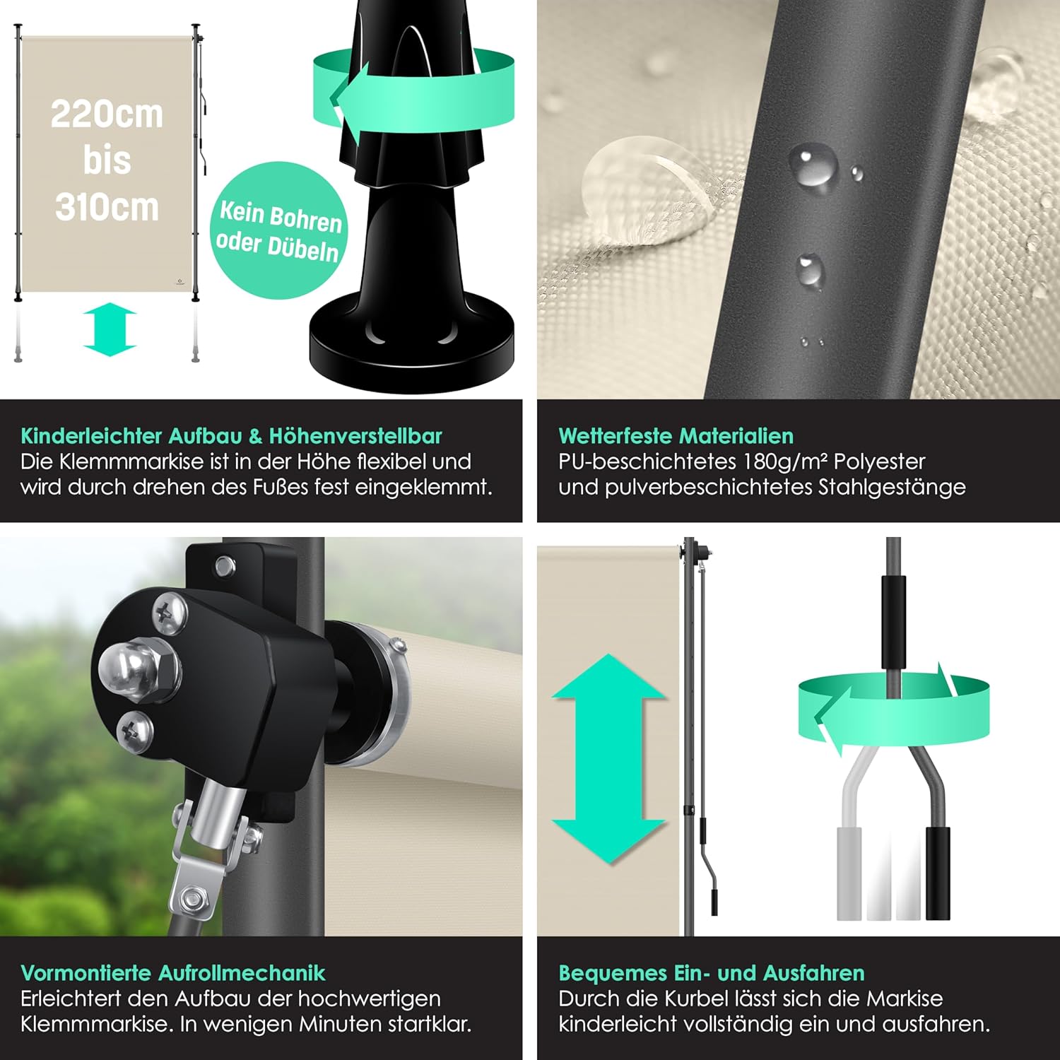 Mit einem kinderleichten Aufbau, der kein Bohren oder Dübeln erfordert, ist diese Markise äußerst benutzerfreundlich. Sie lässt sich einfach einklemmen und ist damit besonders für Mietwohnungen oder Mehrfamilienhäuser geeignet, in denen permanente Installationen oft nicht erlaubt sind. So können Sie Ihren Außenbereich ganz nach Ihren Wünschen gestalten und dabei die Vorzüge eines effektiven Sichtschutzes genießen.