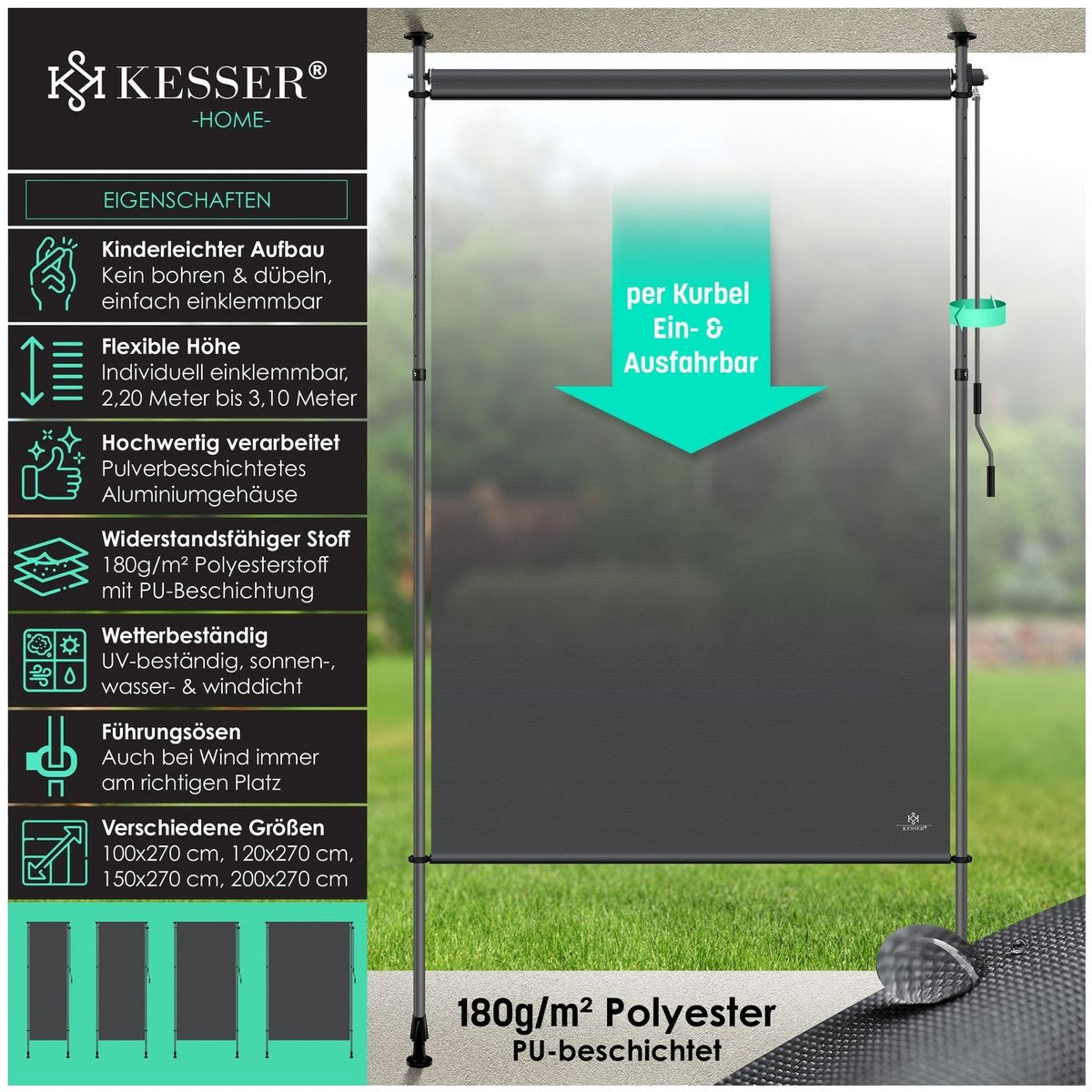 KESSER verticale zonwering: eenvoudige montage zonder boren of deuvels, hoogwaardige afwerking met een gepoedercoate aluminium behuizing, duurzaam doek met PU-coating voor weerbestendigheid, geleideogen voor een stabiele houvast bij wind, handzwengel voor eenvoudig in- en uitschuiven, diverse maatopties.