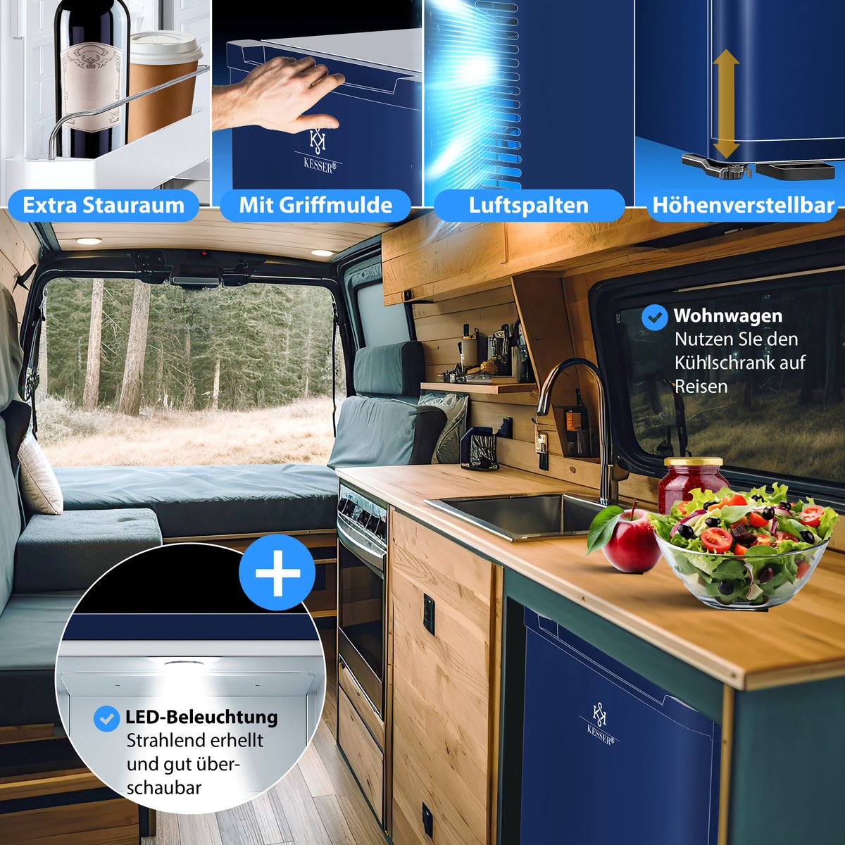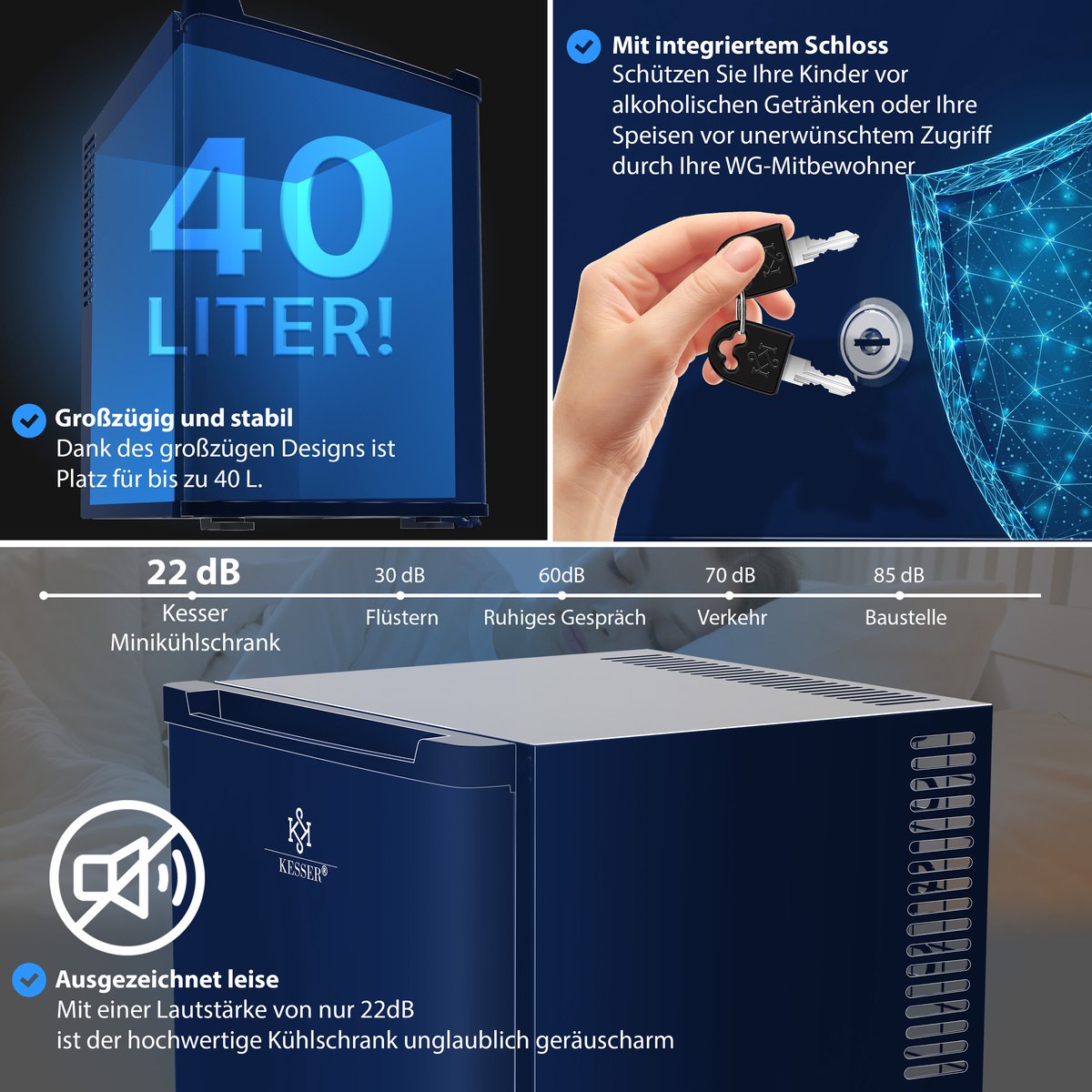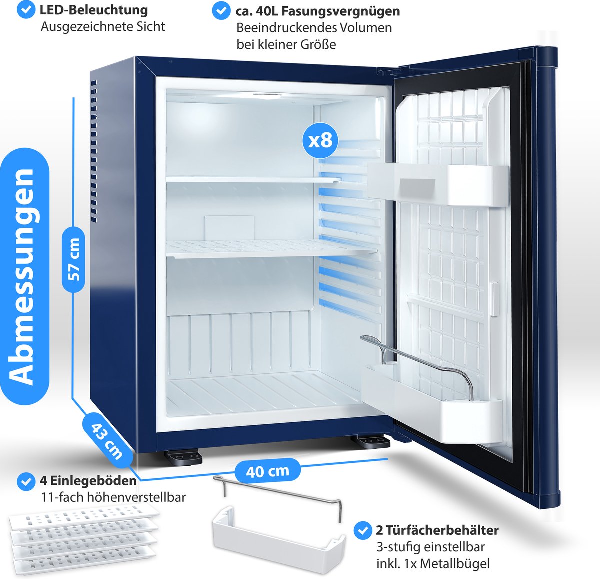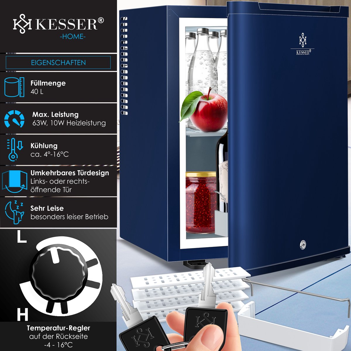KESSER minikoelkast met 40L inhoud, koeling tussen 4°-16°C, omkeerbaar deurontwerp, zeer stil en afsluitbaar, LED verlichting incl. 4 schappen.