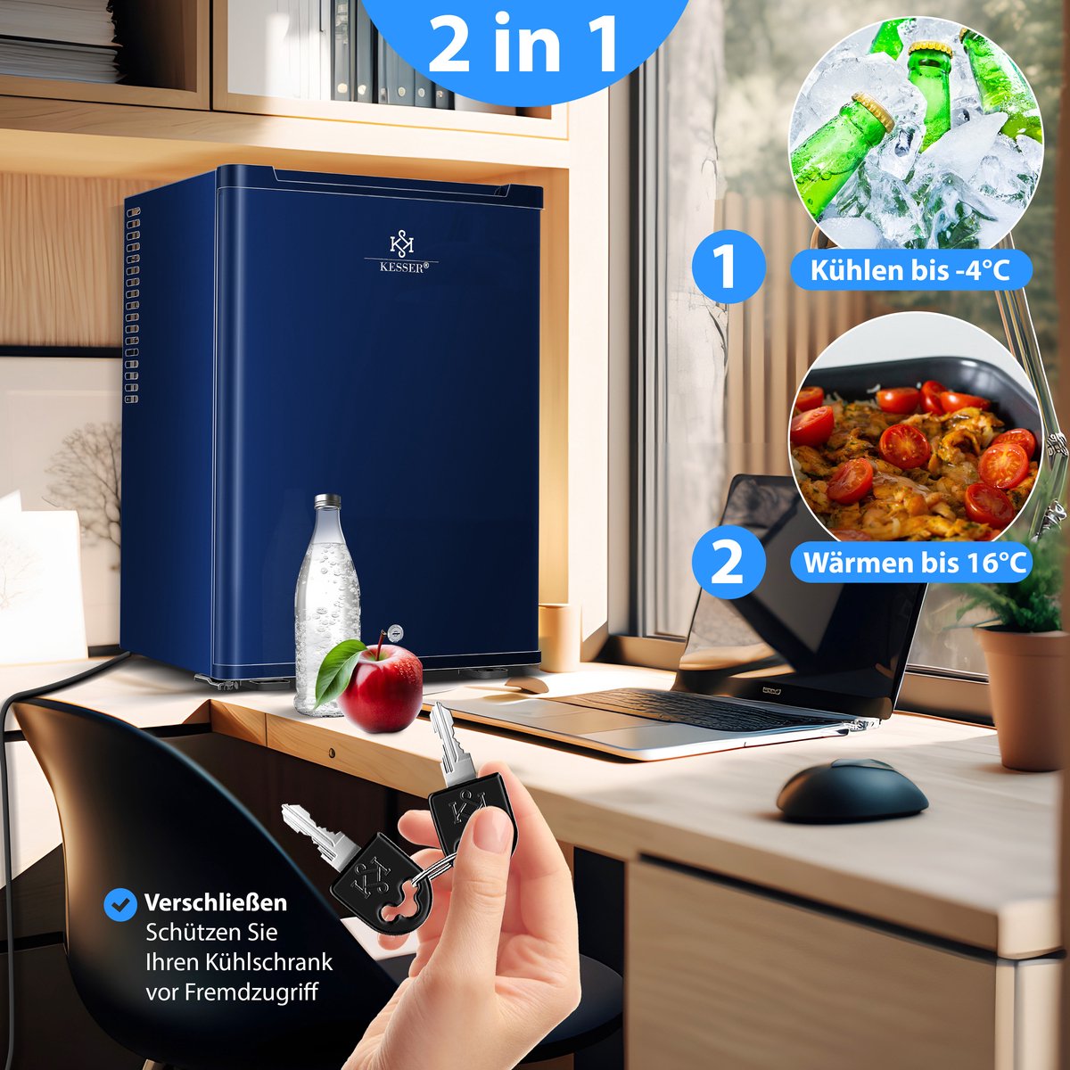 Door het bijzonder lage geluidsniveau is onze minikoelkast ook zeer populair op de werkplek. Zo bent u op kantoor altijd goed voorzien van koele drankjes en vers voedsel. Bovendien hebt u de mogelijkheid om uw koelkastkluis te vergrendelen en uw voorraad te beveiligen. Met twee meegeleverde sleutels kan de minibar gemakkelijk worden geopend en afgesloten.