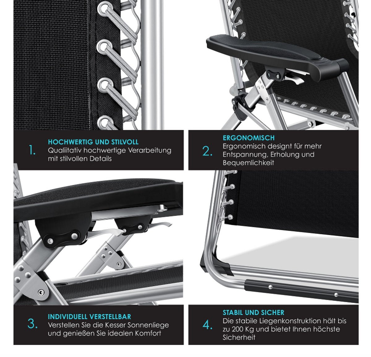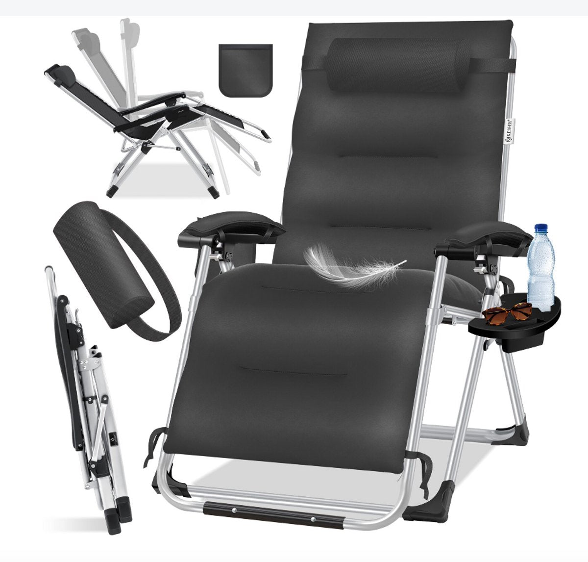 Geniet van de " Zero Gravity " positie en voel u gewichtloos en vrij van alle zorgen na een lange dag werken . Dankzij de comfortabele , afneembare bekleding kunt u heerlijk ontspannen en de positie van de ligstoel met hoge rugleuning op ieder gewenst moment aanpassen . Leun achterover op het comfortabele kussen en leg uw voeten omhoog . Een geïntegreerd opbergtafeltje biedt voldoende ruimte om drankjes , uw smartphone of andere kleine spullen op te bergen .