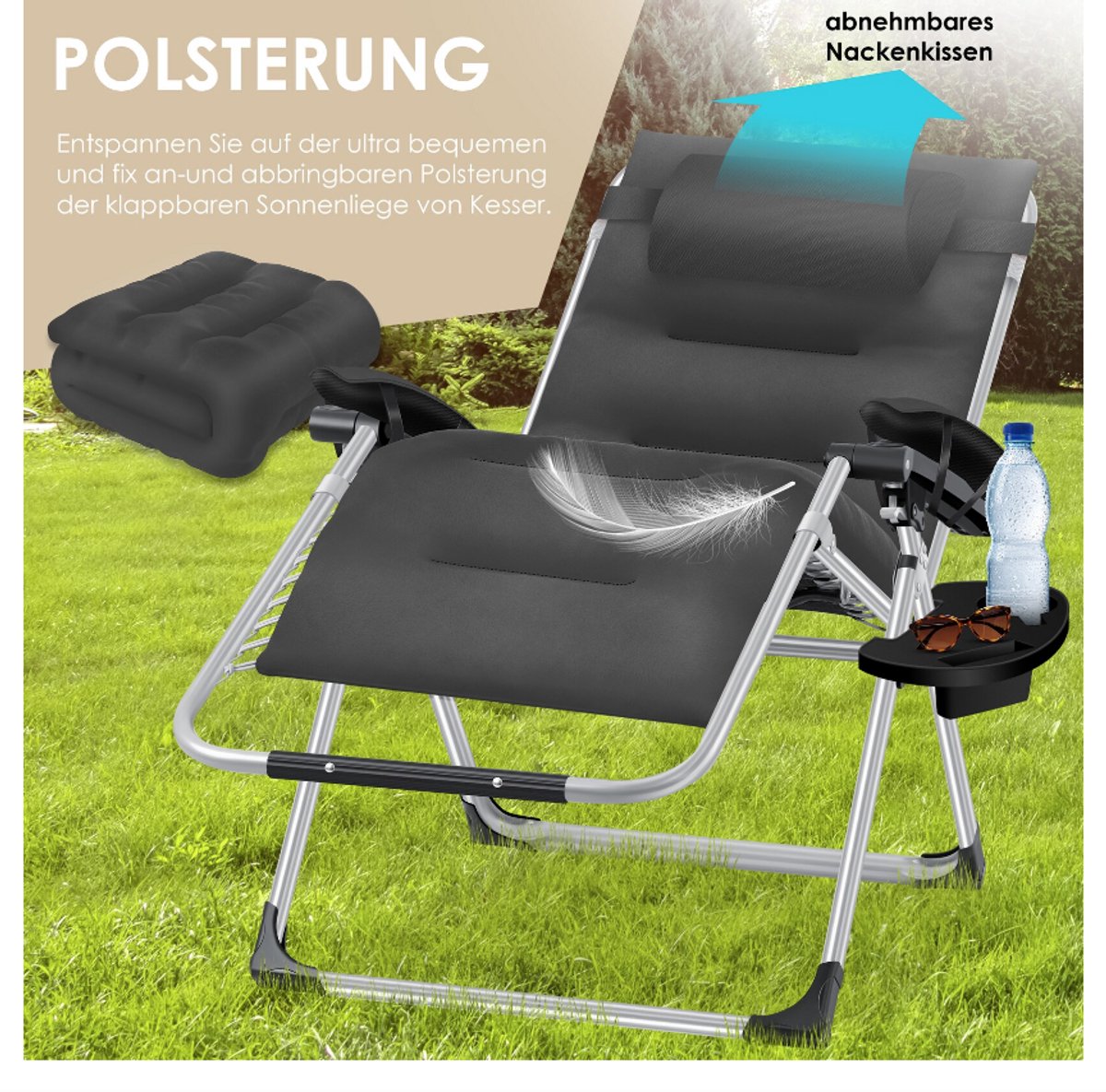 KESSER ligstoel met extra dikke, hoogwaardige bekleding, extra breed en comfortabel ligvlak met ergonomische en gevoerde armleuningen, ademend en slipvast materiaal, inclusief comfortabele hoofdkussens, geïntegreerde opbergtafel, praktische zijvakken. Uiterst stabiele ligconstructie en antislipeigenschappen dankzij hoogwaardige hoeksteunen op de voetframes.