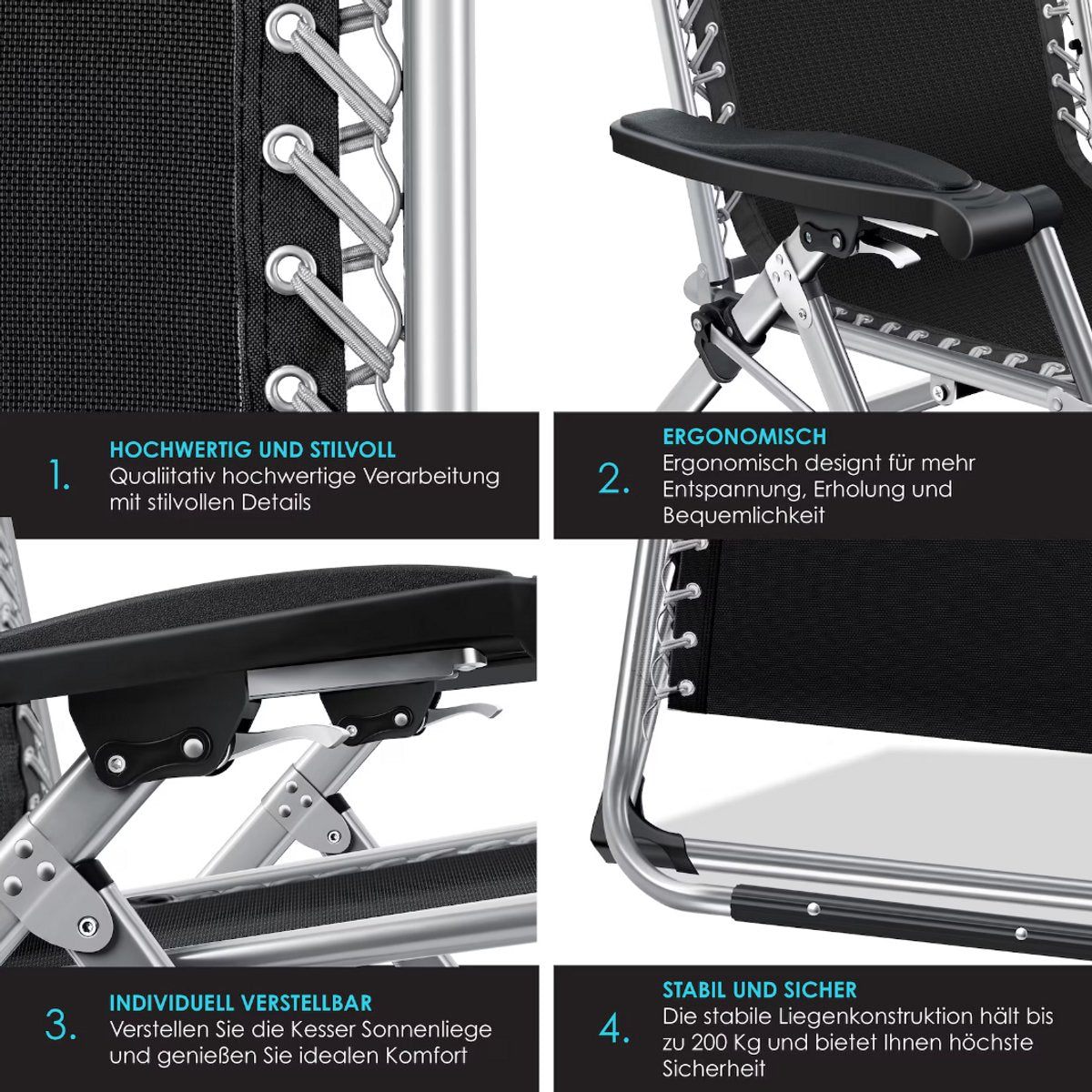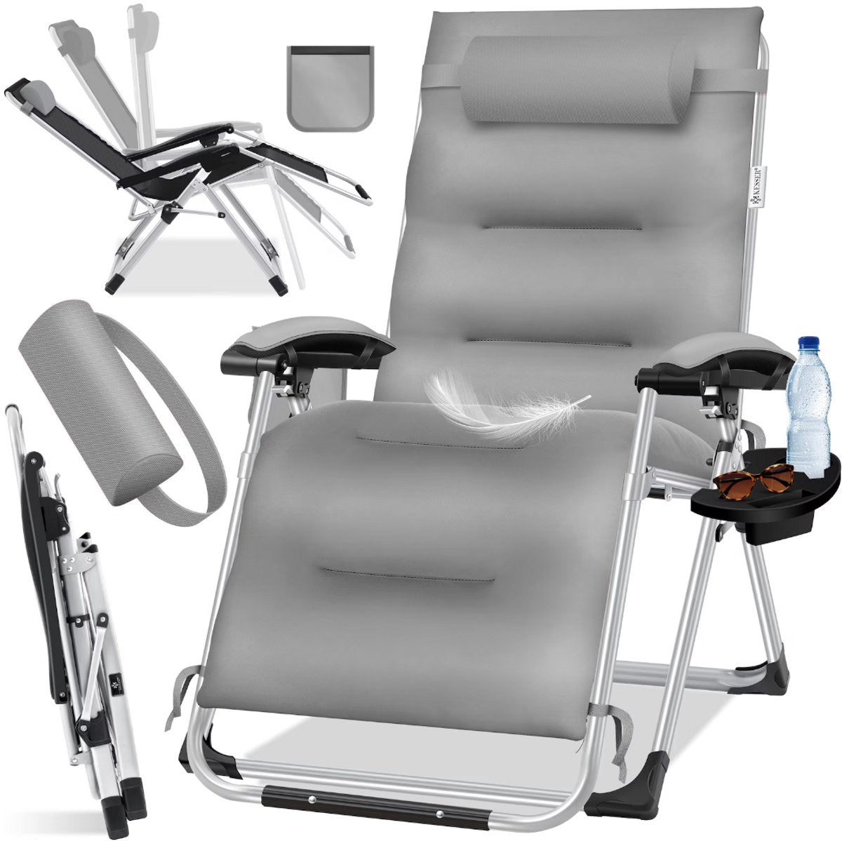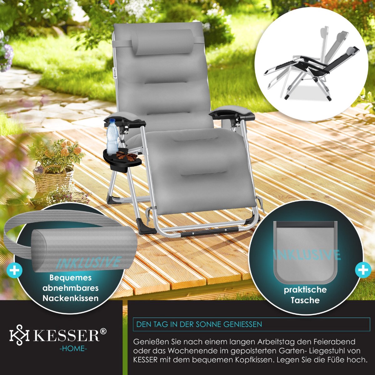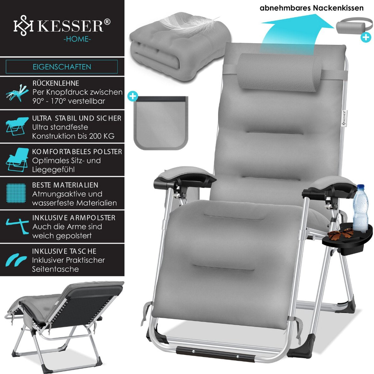 Comfortabel licht met de veiligheid: geniet van de "Zero Gravity" en voel je gewichtloos en bevrijd van alle zorgen nog een lange werkdag. Met de comfortabele en liggende bekleding kun je ontspannen en de positie van de opvouwbare ligstoel altijd aanpassen. Leun aan het comfortabele hoofdkussen en leg je voeten omhoog. Een geïntegreerde opbergtafel en een zijvak zorgen voor voldoende ruimte om dranken, smartphones enz. op te bergen.