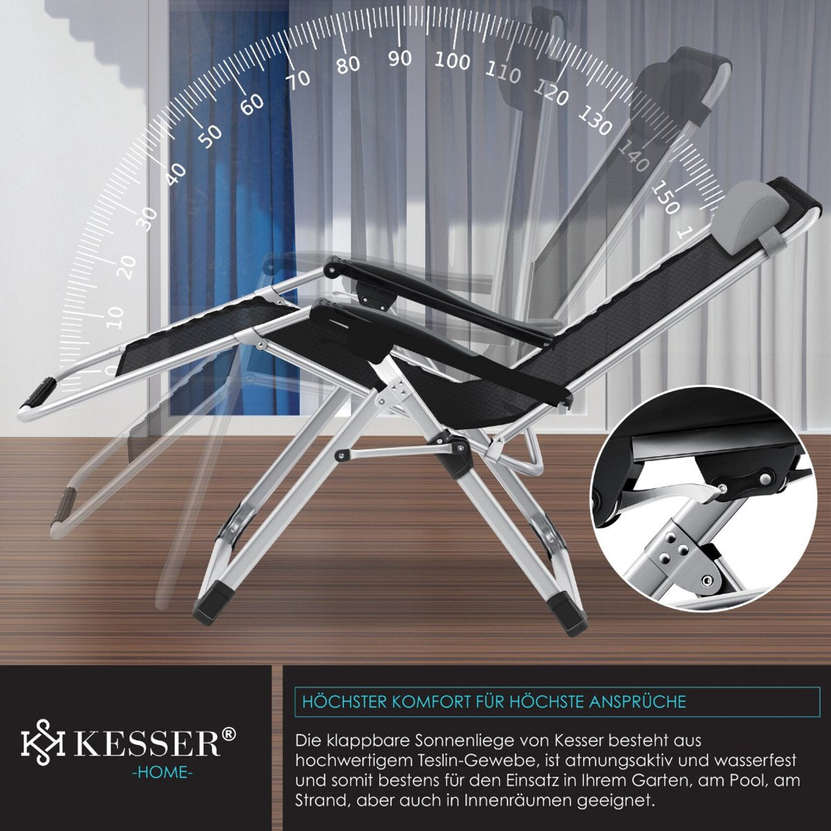 Onderhoudsvriendelijk: de ademende Teslin-pad zorgt voor een gezellige en comfortabele ligmogelijkheid, waarop je in alle rust een boek kunt lezen en van de zon kunt genieten. Voor een lange levensduur kunnen de kussens snel en eenvoudig van de ligstoel worden verwijderd en gereinigd. Ook het frame kan eenvoudig met een vochtige doek of je tuinslang worden gereinigd.