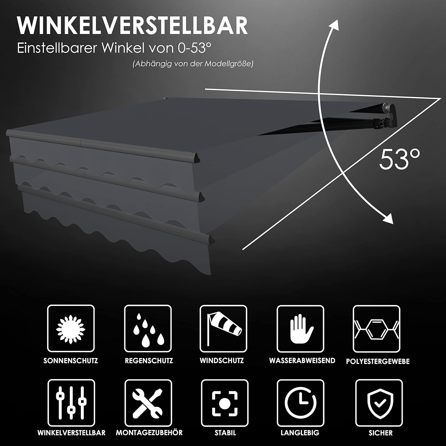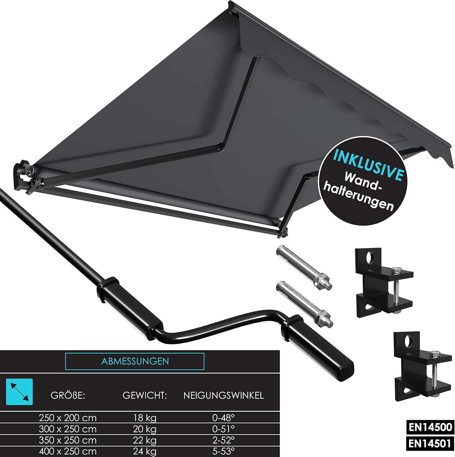 Verkrijgbaar in vele kleuren en maten; hoogwaardige en robuuste constructie; ultra stabiele scharnierarmen; biedt je bescherming tegen windingebouwde hellingshoek. Inclusief stabiele wandhouder. Duurzaam en UV-bestendig, waterafstotend polyesterweefsel, snel en gemakkelijk te bedienen via handslinger. Eenvoudige en eenvoudige montage; robuust aluminium frame, functioneel materiaal, praktische en hoogwaardige arm