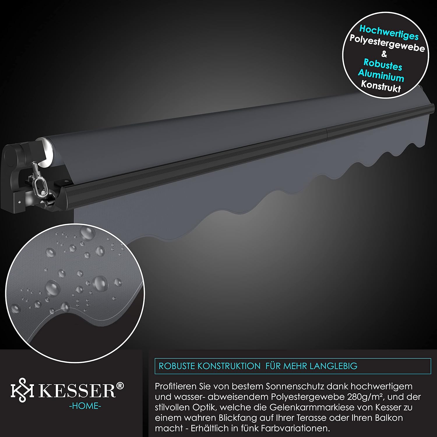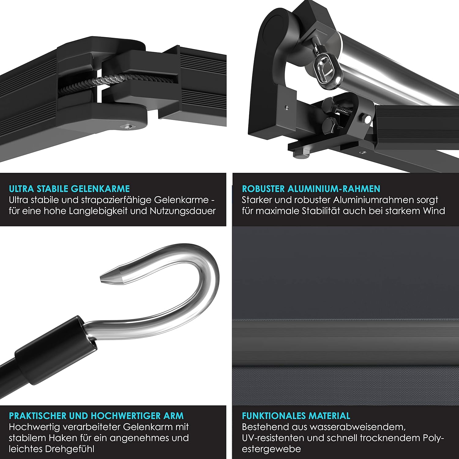 • Hoogwaardige en duurzame scharnierarmen garanderen je een hoge duurzaamheid en gebruiksduur. Bovendien zorgt een sterk en robuust aluminium frame voor maximale stabiliteit en dat zelfs bij sterke wind. Door de verwerking van hoogwaardig aluminium is de vorming van roest uitgesloten, daardoor glanst de balkonluifel ook na meerdere jaren.