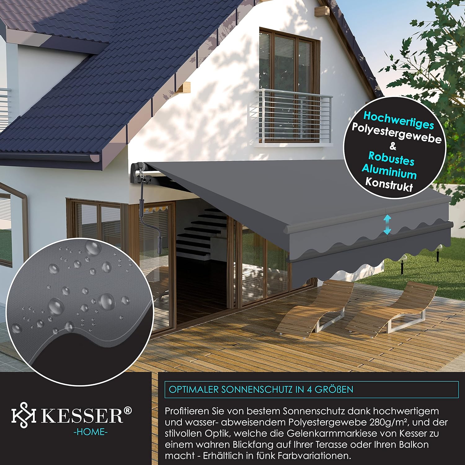 • Perfecte bescherming: helaas heeft niet iedereen een zonwering zoals bijvoorbeeld rolluiken op je raam of wil je niet de ruimte met een parasol verstellen. Zonnezeilen zijn weliswaar een alternatief, maar helpen vaak alleen als de zon ook uit de juiste richting schijnt. Daarom raden wij je onze hoogwaardige zonneluifel van KESSER