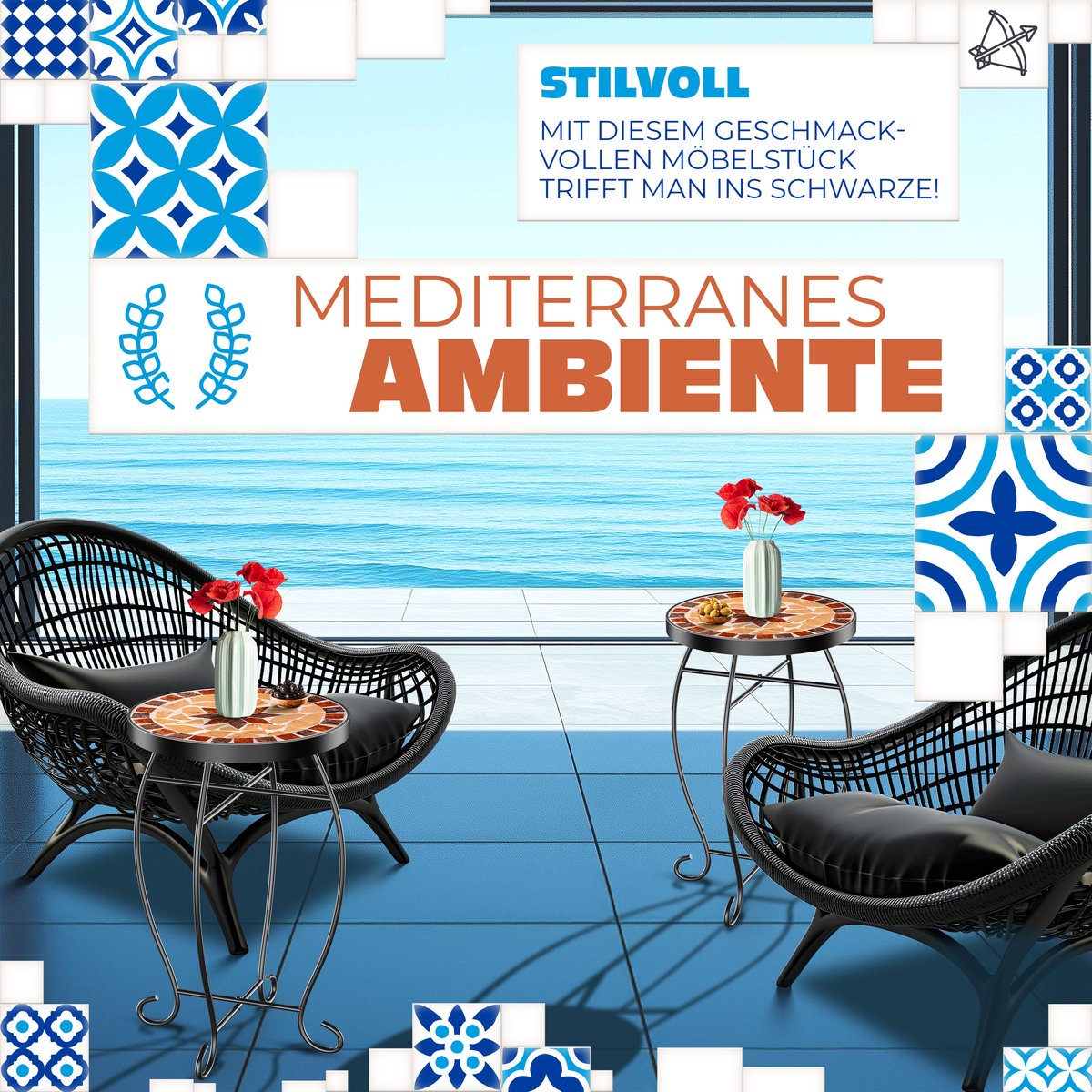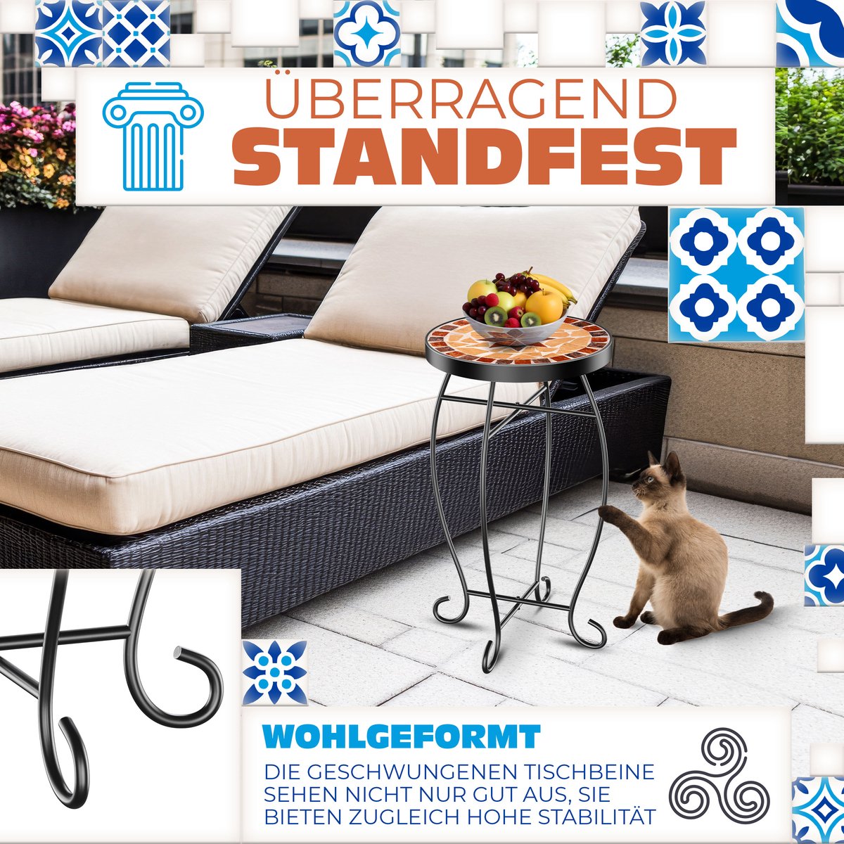 De weerbestendige mozaïektafel van zwaar steenmozaïek en gepoedercoat metaal is een absolute blikvanger op je balkon, tuin, terras, binnenshuis en in de gastronomie. Geniet van de mediterrane sfeer. Door de hoogwaardige verwerking van het materiaal is je bijzettafel bestand tegen alle weersinvloeden in de buitenruimte en garanderen we je een product met een lange levensduur.