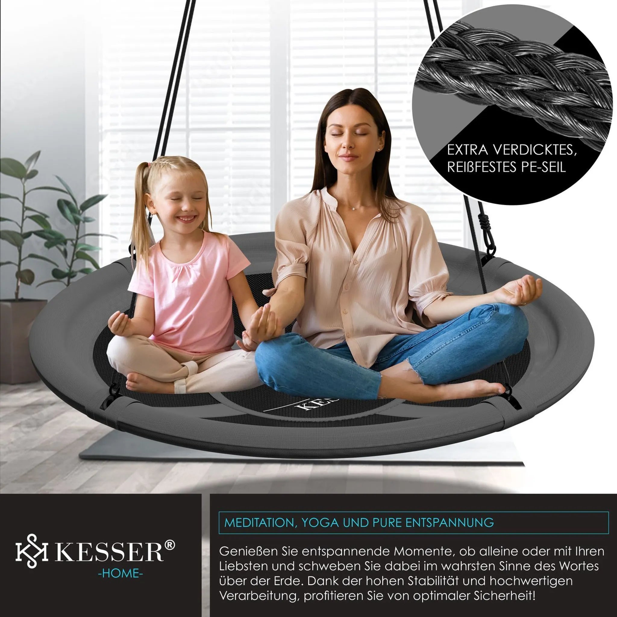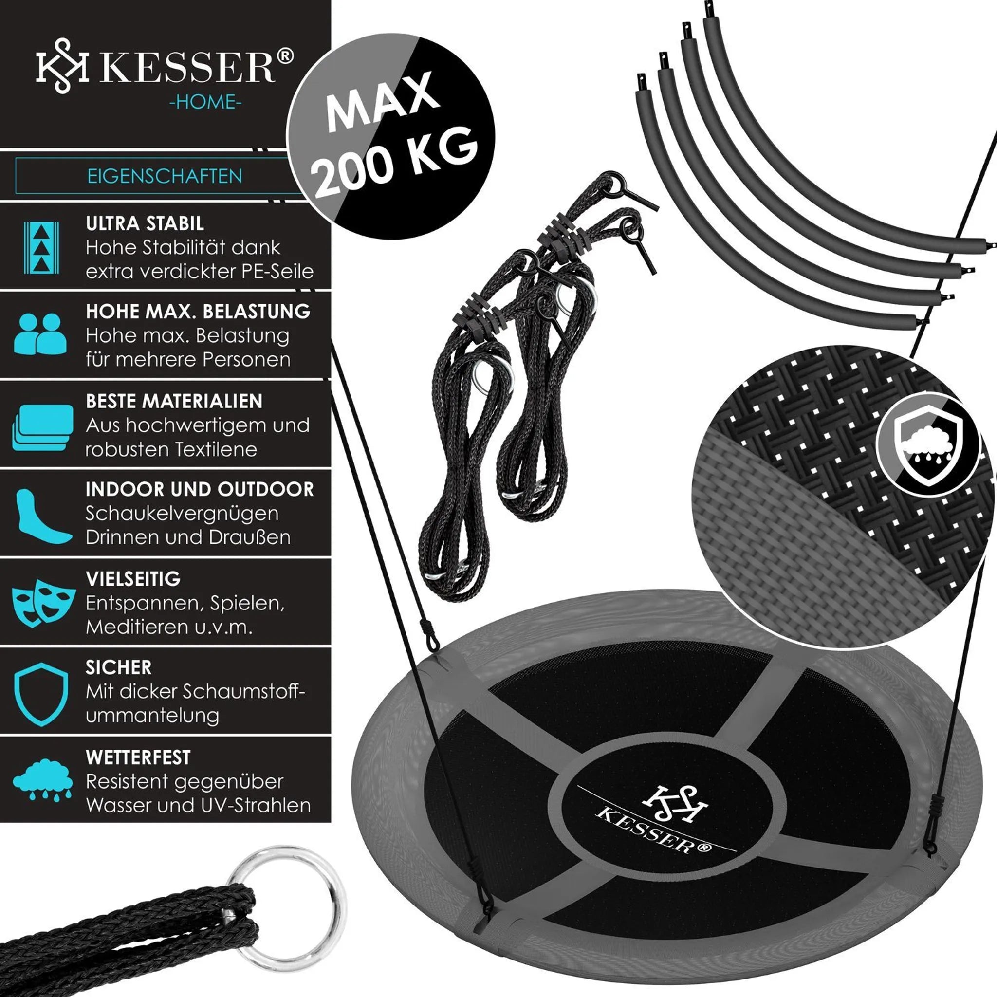 KESSER ronde kinderschommel, hoge stabiliteit door extra dikke PE-touwen, hoge belastbaarheid door hoogwaardig en robuust textiel, geschikt voor binnen- en buitengebruik, veilige en dikke schuimcoating, bestand tegen water en UV-straling