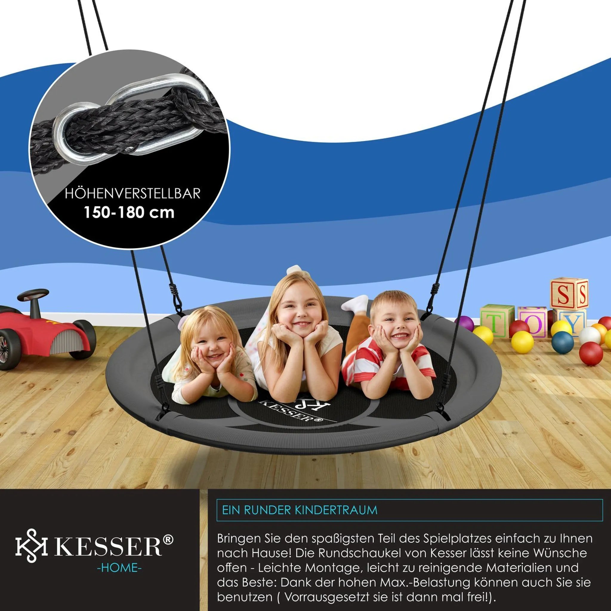 Haal het leukste gedeelte van de speeltuin naar uw huis ! De ronde schommel van KESSER laat niets te wensen over . De montage is snel en eenvoudig uit te voeren . Dankzij de eenvoudig te reinigen materialen kunt u de schommel eenvoudig afnemen met een vochtige doek .