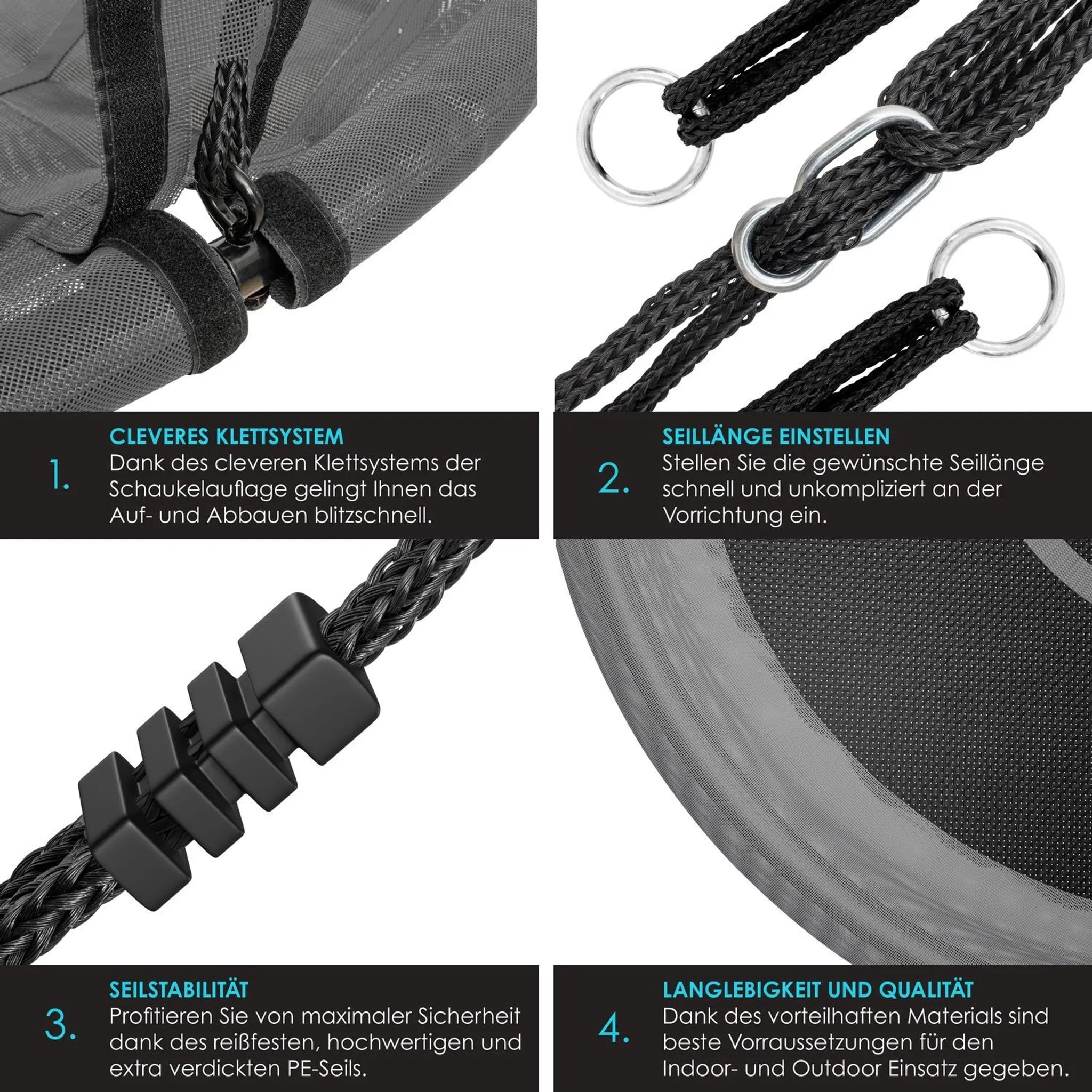 De schommel is bovendien in hoogte verstelbaar . In combinatie met het hoge draagvermogen kunt u de schommel ook zonder problemen gebruiken (mits deze op dat moment vrij is). Het extra dikke en scheurvaste PE- touw zorgt ervoor dat de hangschommel een bijzonder hoog draagvermogen heeft .